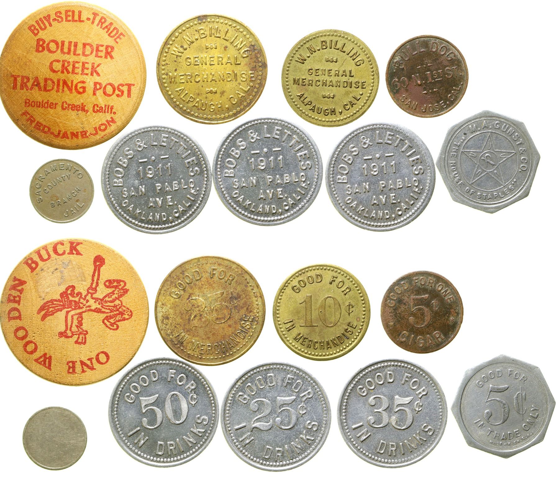 Lot of nine tokens: W. N. Billing, Alpaugh (2); Bobs & Letties / 1911 San Pablo Ave. / Oakland (3); Sacramento County Jail; M.A. Gunst, San Francisco; The Bulldog, San Jose; Boulder Creek Trading Post, Boulder Creek.