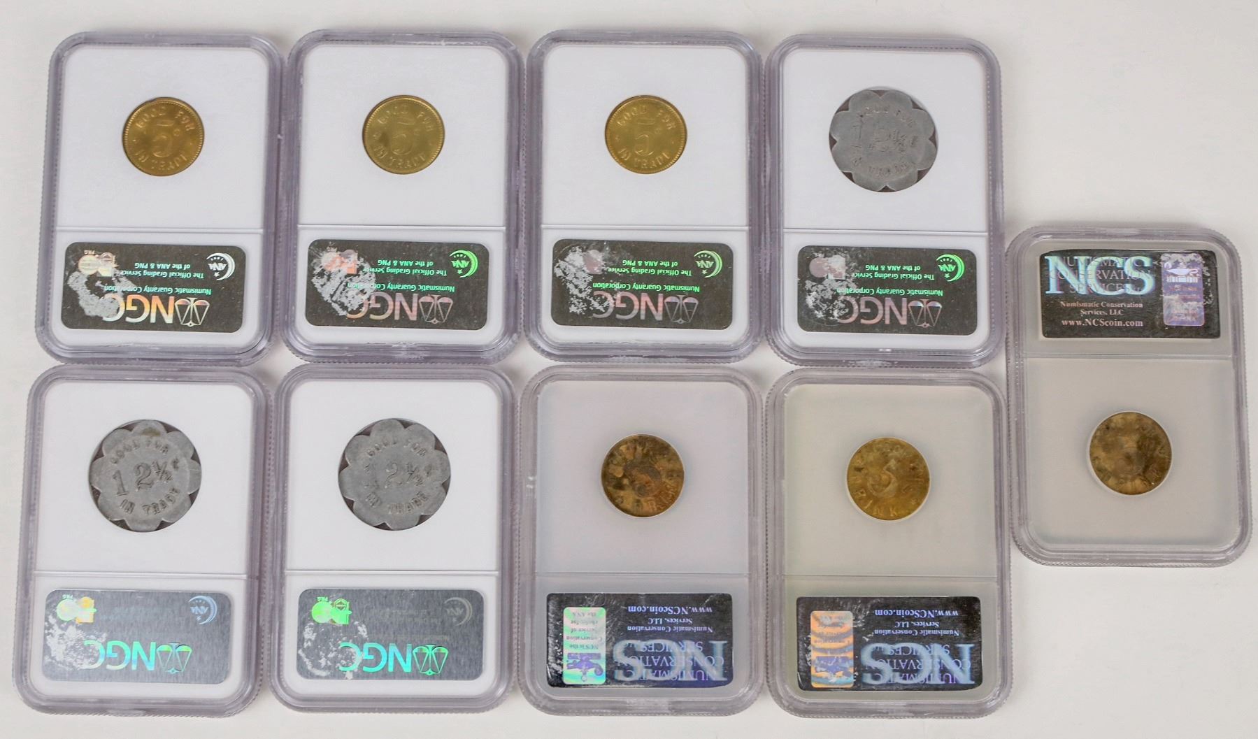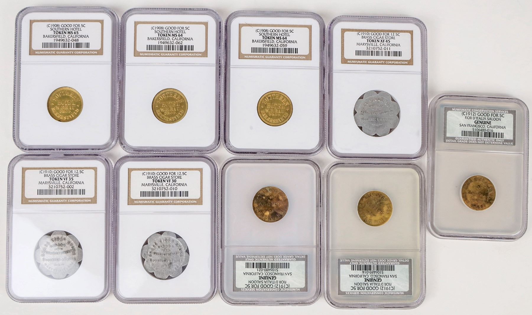 Nine certified California tokens, three each: 1) Fior D'Italia Saloon, San Francisco; GF 5c, Genuine. 2) Brass Cigar Store, Marysville; GF 12 1/2c; VF 30, 35, XF 45. 3) Southern Hotel, Bakersfield; GF 5c; MS 64, 64 & 65.