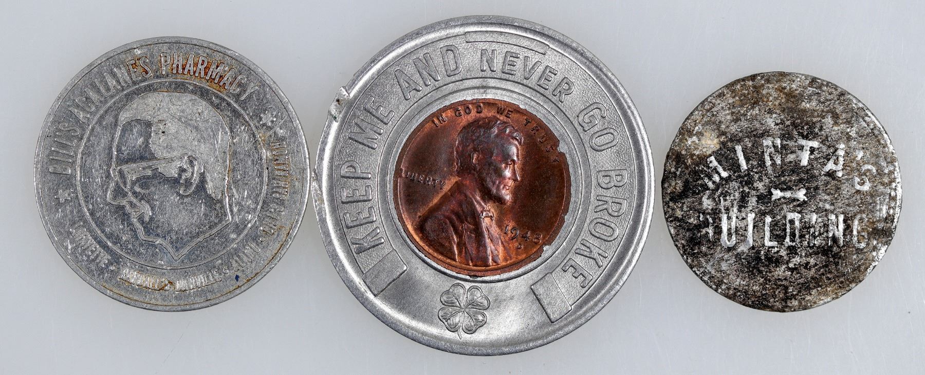 3 California tokens. Mintas Building, Oakley, GF 1 Drink. Bill's Acalane's Pharmacy, Oakley, GF 1 Drink. Claar Chevrolet, Richmond K11. California