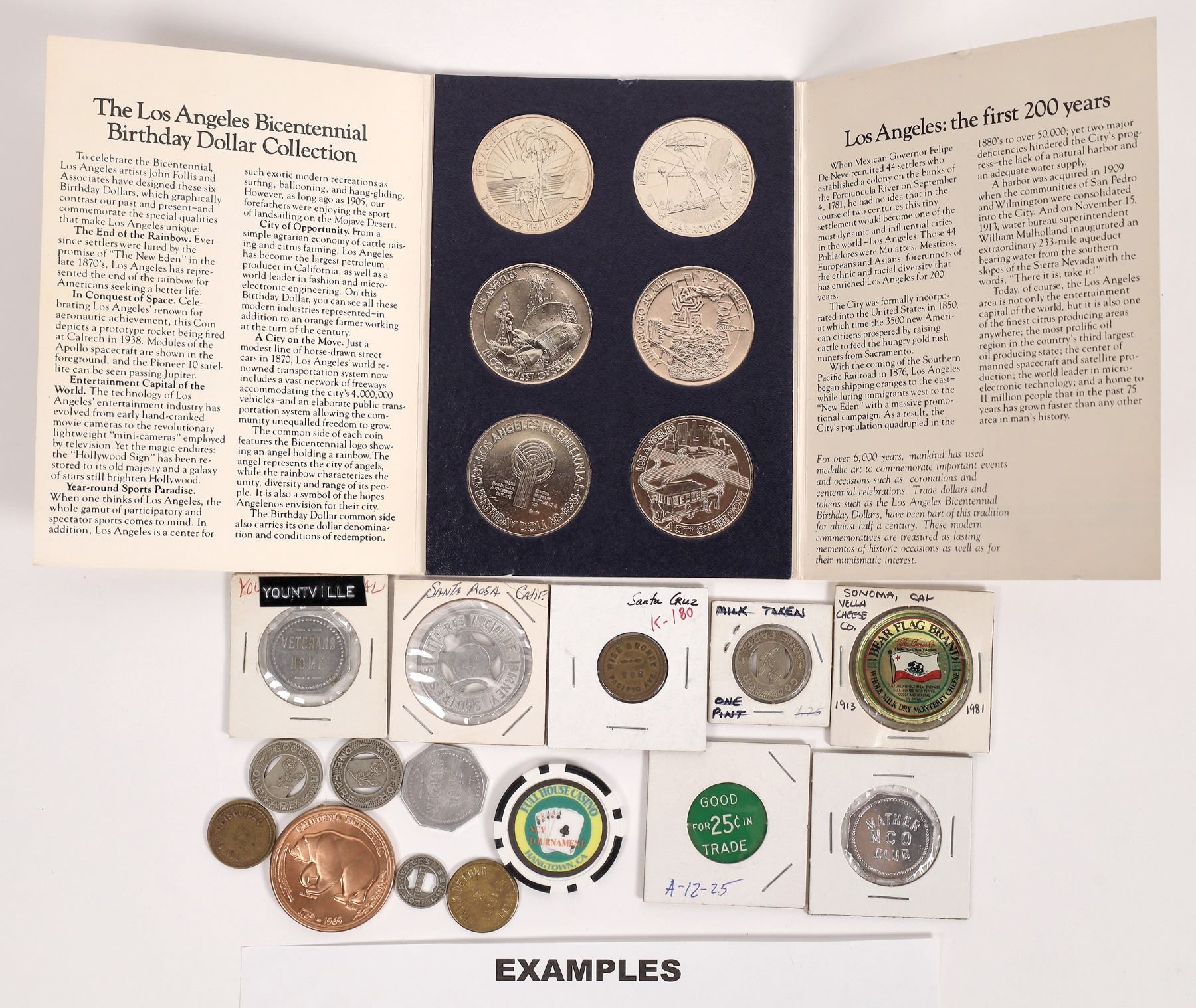 Lot of over eighty pieces of California history. 1990 U. S. Mint Yosemite National Park Centennial medal, Unc. in original plastic; 1969 California Bicentennial (3); 1939 Golden Gate International Exposition unused 3 cent stamps (6); Los Angeles Bicentennial Birthday Dollars (6); Full House Casino poker chips, Hangtown; transportation tokens, Gibson Lines Sacramento fare tokens (over 30); California