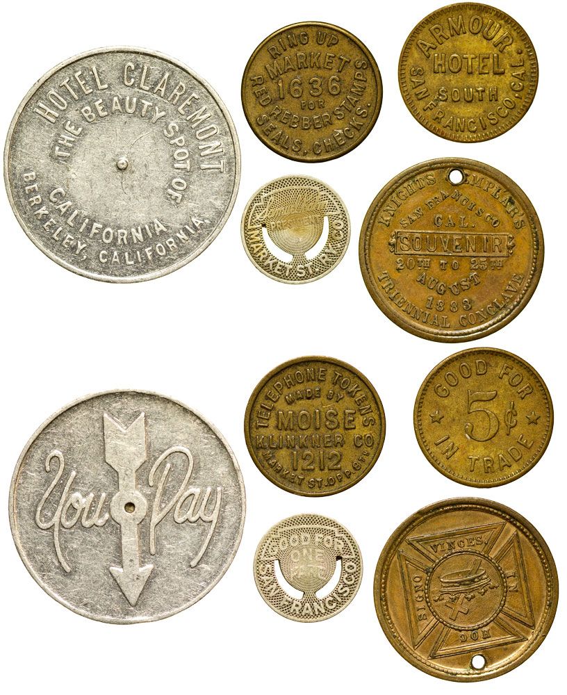 Lot of 5. San Francisco: 1) Moise Klinkner Telephone Advert. VF. 2) Knights Templar, 1883. Holed, F. 3) Armour Hotel SSF. GF5cIT. Fine. 4) Market St. Bus, 1938. GF1 fare. VF. 5) Berkeley, Hotel Claremont. "The Beauty Spot of California." You Pay. Fine. The hotel Claremont sits at the foot of the Berkeley Hills and overlooks the San Francisco Bay. Date: c1880 CA hwac 10117