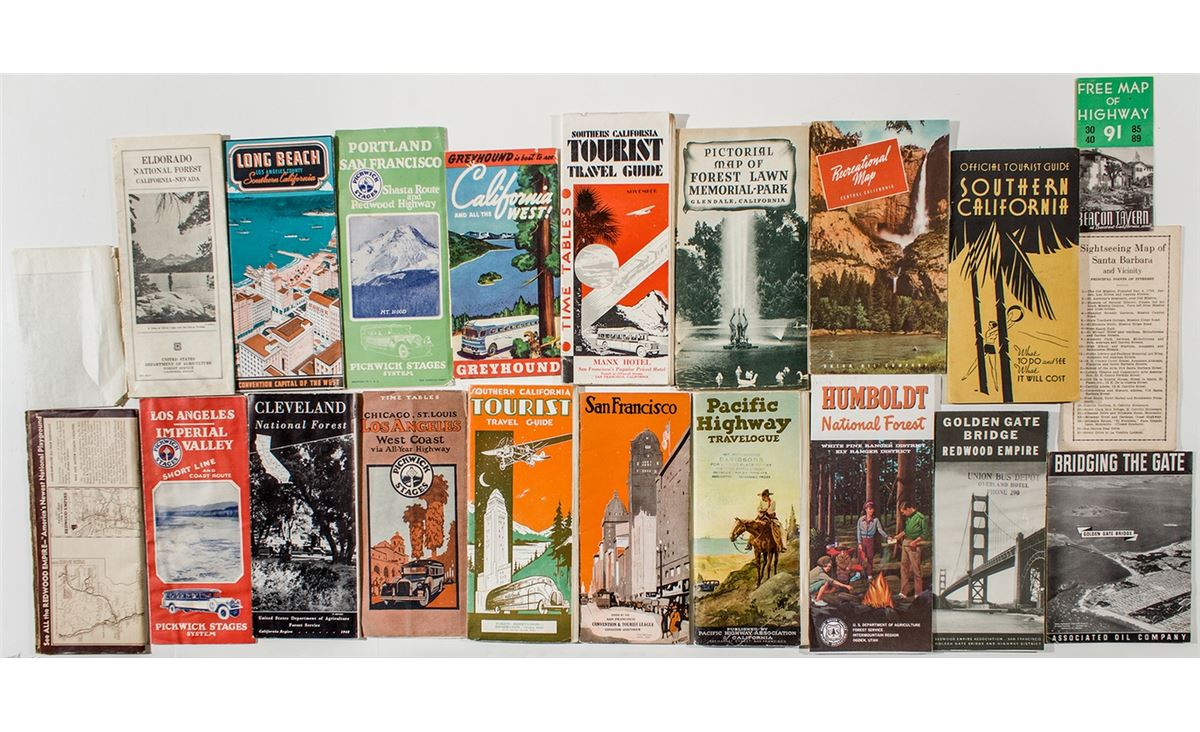 19 tourist maps of various California attractions: Shasta/redwood Highway, Greyhound Bus Travel, Pacific Highway, San Francisco, Redwood Empire, southern California, Humboldt National Forest, etc.