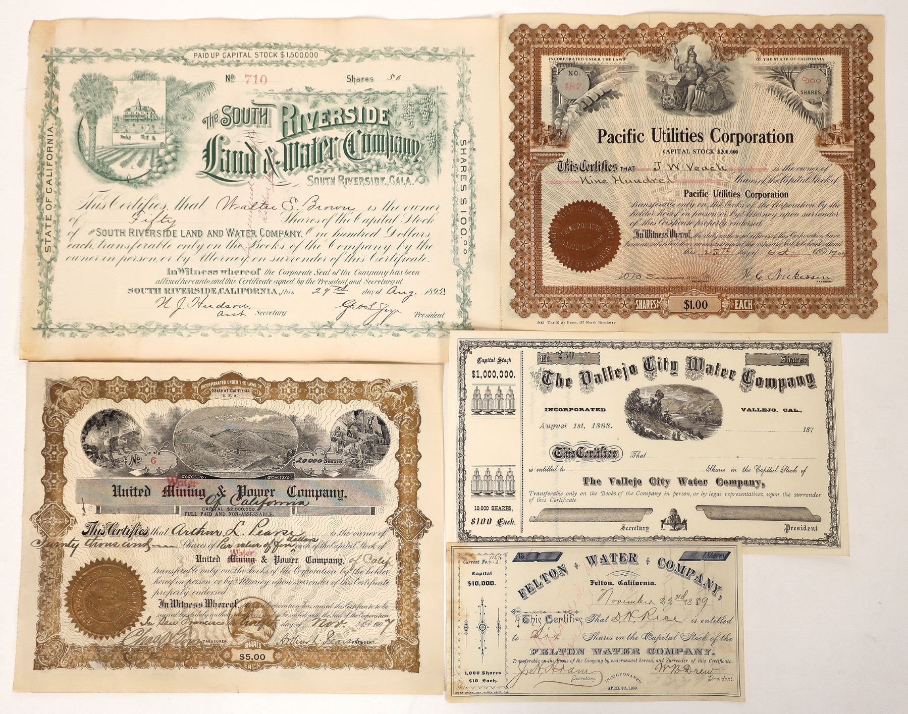 Utility stock certificates include, Pacific Utilities Corporation, United Water & Power Company, The Vallejo City Water Company, The South Riverside Land & Water Company and Felton Water Company. All, except the Vallejo piece are issued and cancelled. Please see photos for more details.