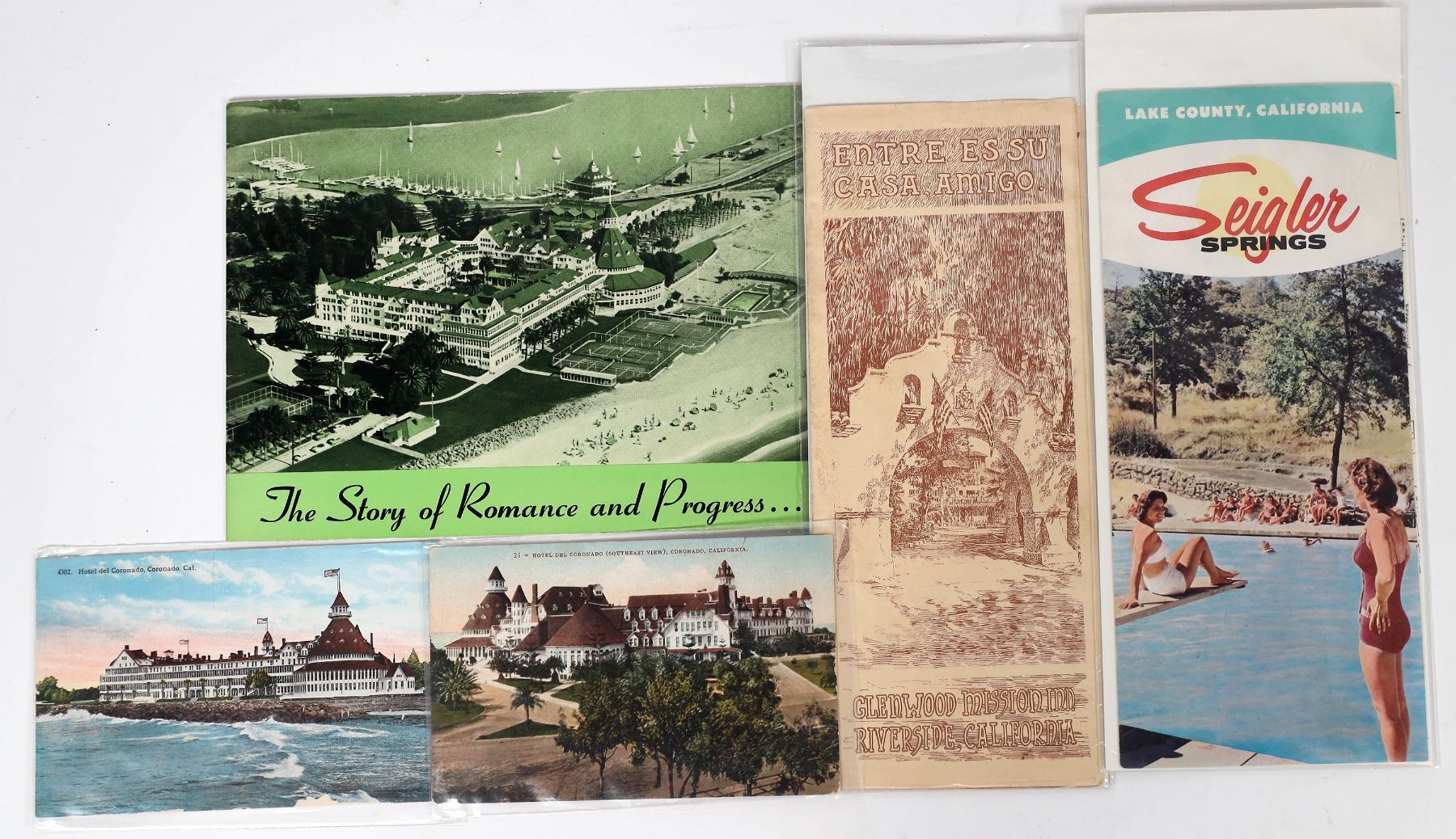 Seigler Springs, Lake County, C-1960's ~ 8 different mineral springs, scores of activities & amusements ~ 4-fold color brochure with insert, includes map & description of the property Lake Tahoe, publ. by Lake Tahoe Sierra Assn., C-1940 ~ Color multifold brochure consists of points of interest with photos & the backside, when unfolded, shows 3 maps, one being a wonderful map of Lake Tahoe, identifying the hundreds of lodges, camps, inns, etc. that surround it Skaggs Hot Springs, Sonoma Co., C-1915 ~ Noted for their climate & medicinal virtues ~ (3 O" x 6 ∫" booklet, 14 pages) Hotel del Coronado, Coronado, San Diego Co., 1959 ~Became World famous when built in 1886 and still is after 136 years of operation ~ (8" x 6" booklet, 24 pages) ~ Includes 2 postcards Glenwood Mission Inn, Riverside, 1923 ~ Original adobe home dates back to the 1870's and was the small beginning of the present Mission Inn ~ 4" x 9" multi-fold brochure has 11 pages covering history, floor plans for the lobby and art shop, plus a self-guide to the entire premises
