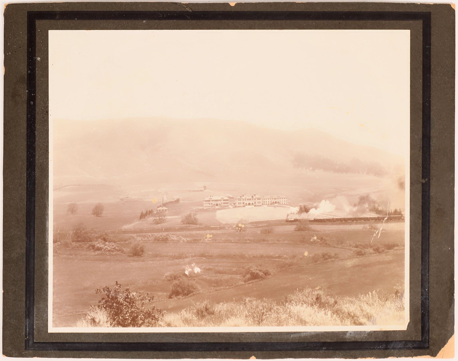 Photo of a building and a train, possibly California Veterans Home in Yountville. Land is otherwise undeveloped. 7.75x9.5". Scratches and abrasions. Please inspect.