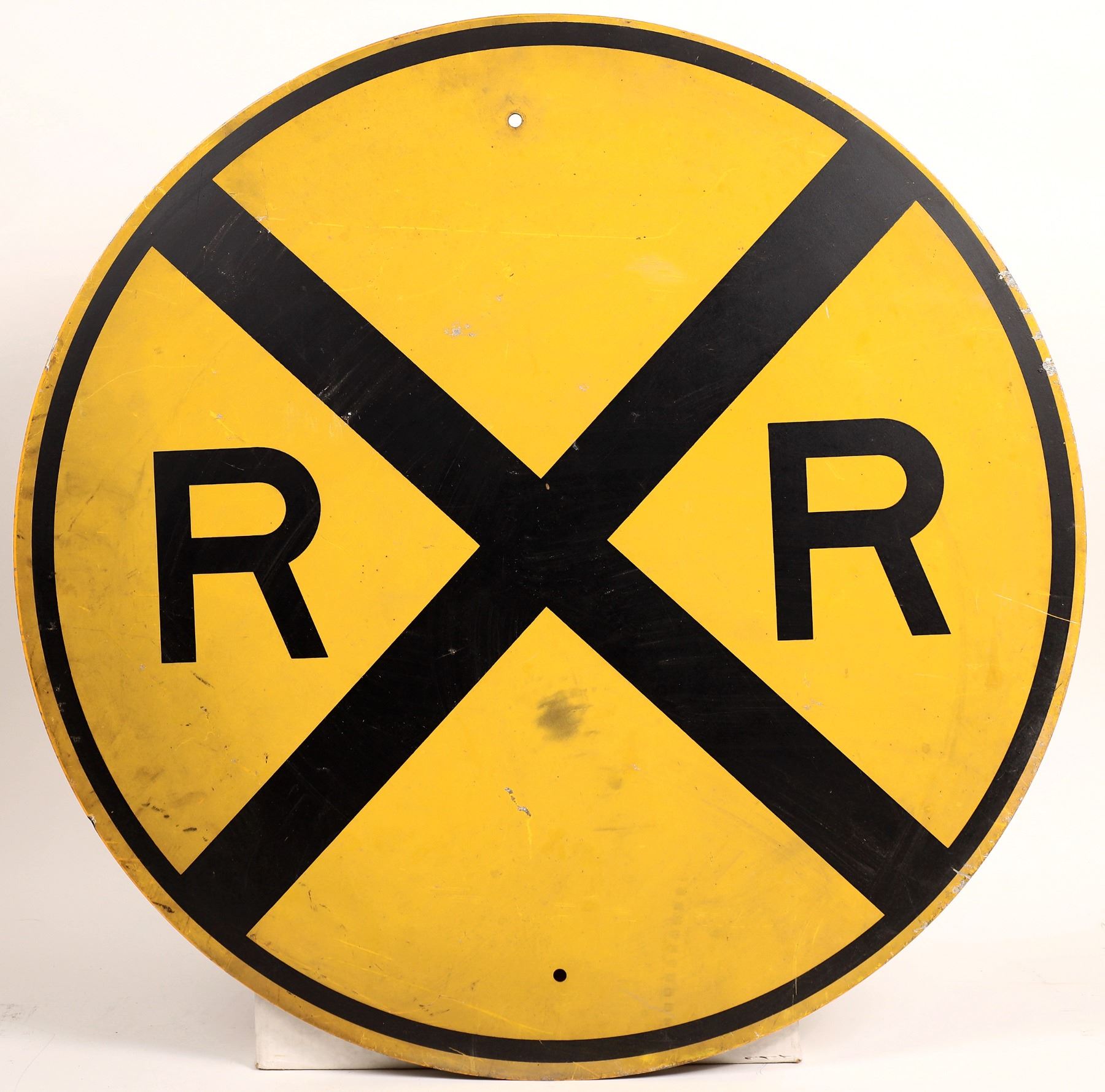 Vintage old style yellow "RR" sign. We believe this sign is from the Nevada City, CA narrow gauge railroad. 30". Back has orange spray painted Stop/Bridge/Out which does not detract from the aesthetic when wall mounted. Front has some edge wear and slight discoloration which may clean up. California