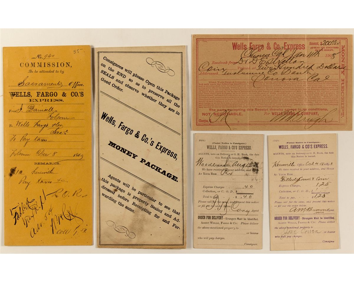 Lot of 5. 1) WF & Co. Express Commission. Dated Folsom, Dec. 8, 1869. To be attended by the Sacramento Office. 2) Money receipt. Dated Chinese, Cal., Jan 4th, 1908. Received coins valued at $200 addressed to Tuolumne Co. Bank in Sonora, Cal. 3) Two postal notices to consignees. One from the Woodland Office, dated Aug. 13, 1889. The other is from the Kernville Office, dated April 4, 1893. Respective cancels. 4) Unused (but with wear) WF & Co. Express money package envelope, c.1870s.