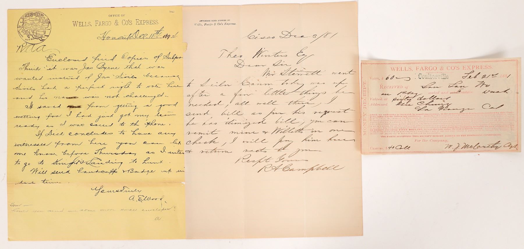 Wells Fargo ephemera, c. 1881-84. 1881 Coulterville receipt, 1881 letterhead, 1894 letterhead with left side fraying. California c1881-84