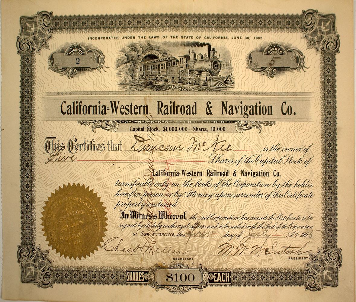 Better known as the Skunk Railroad it traveled from Fort Bragg to Willits. This is CERTIFICATE # 2. Made out to Duncan McNee. Signed by Charles Weller secretary and MN McIntosh president. Signed on back by McNee. Three months after getting the stock he transferred it to the Union Lumber Company. The California Western connected to the Union Lumber Company. McNee,Weller, and McIntosh were all on the Board of Directors of the railroad. (George Garfield & Robert Greenawalt Railway Express and Wells Fargo Collection) State: California City: Fort Bragg Date: 1905 FHWAC#: 41730