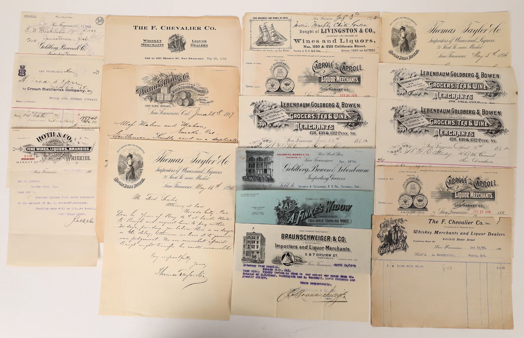16 California whiskey ephemera items, c. 1870's to 1918. Mostly San Francisco, 1 Jamestown. Roth & Co., Crown Distilleries, Carroll & Carroll, Thomas Taylor etc. California San Francisco