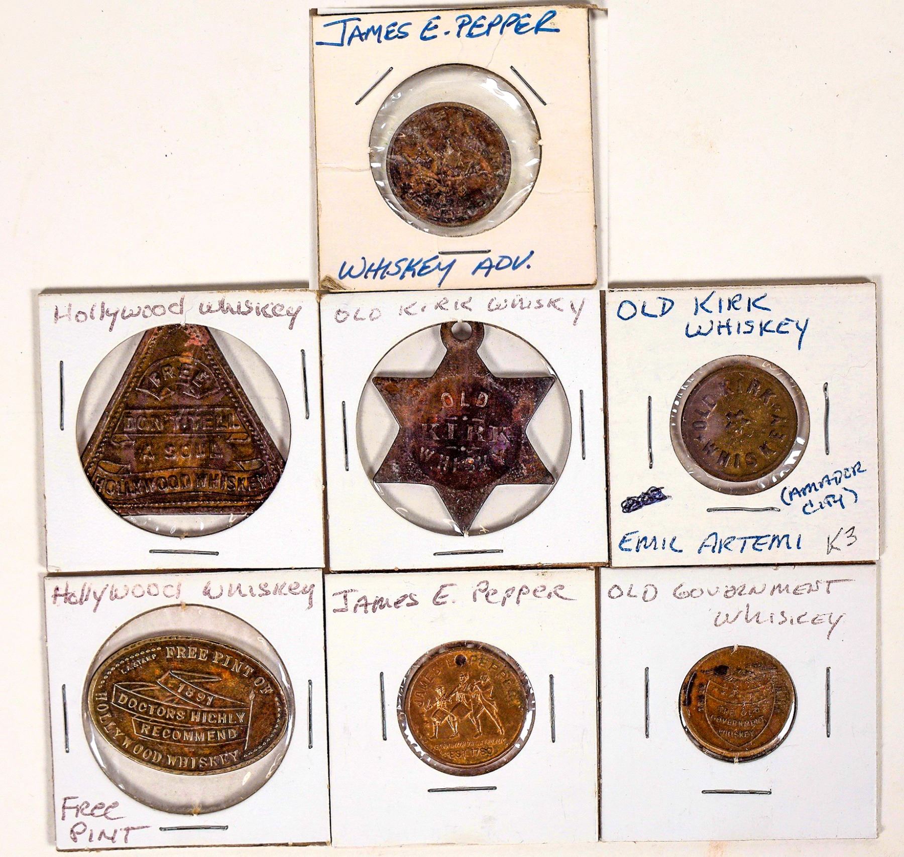 Seven tokens from California whiskey makers: Hollywood whiskey (2 different); Old Kirk whiskey(2 different); James E. Pepper (2); Old Government whiskey. Perfect for California whiskey bottle collectors._x000D_