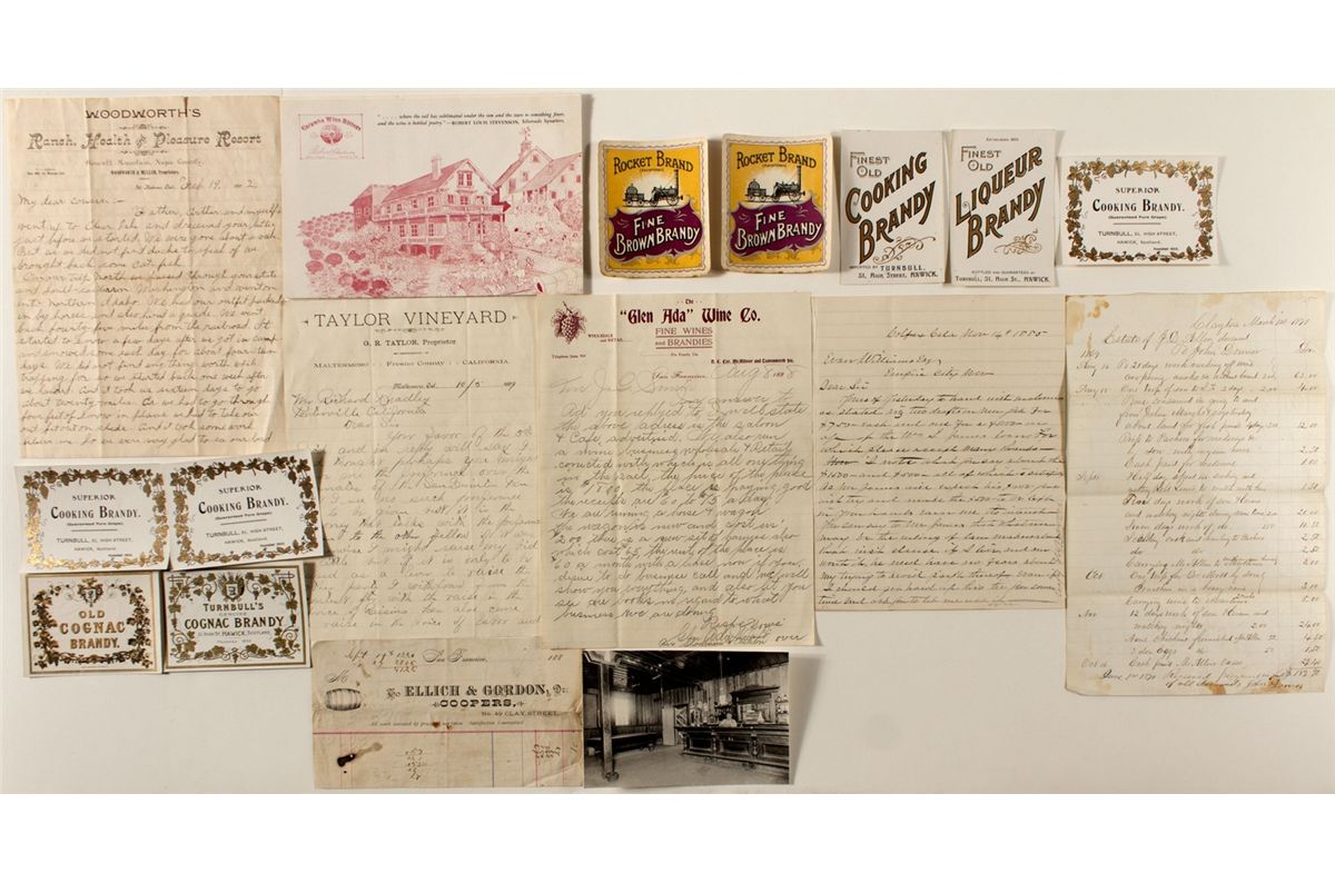 Large group of various wine-related correspondence, includes newspaper reproduction, billheads, historical photo, letters and vintage brandy bottle labels. All in good to excellent condition. Date: c1870-1912 CA hwac 20332