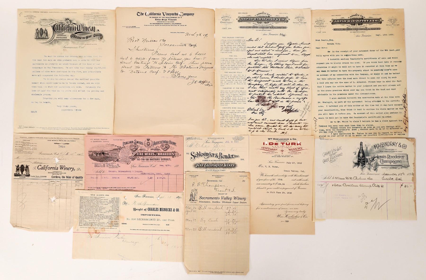 12 California wine ephemera items from Sacramento and San Francisco. c. 1892-1919. California Winery, Italian Swiss Agricultural Colony, Macondray(Louis Roederer importer), Charles Meinecke. 1906 California Winery letter state due to a loss of nearly 40 million gallons of wine, "the loss of half the wine in the state" will affect pricing. California