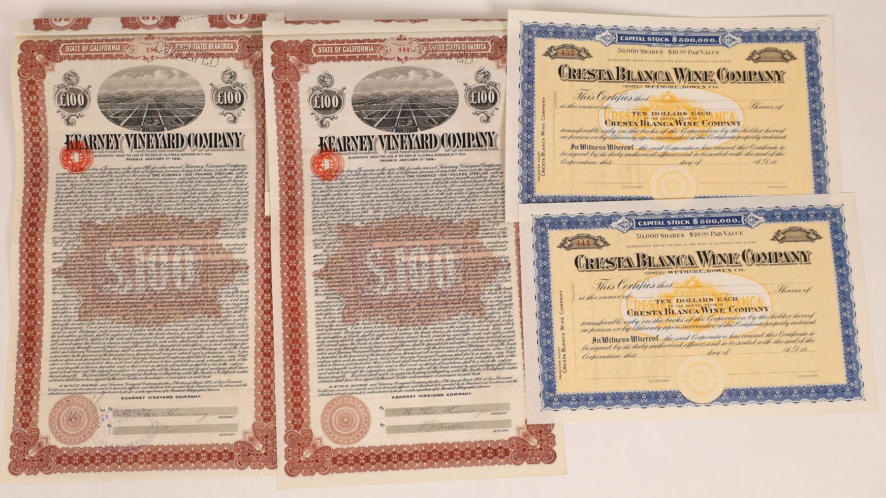 Lot of 4, two different companies. 1) Kearney Vineyard Company. Two L100 bonds issued in 1906. Signed by M. Theo. Kearney as president. Brown border, black print, and vignette of vineyard. Ten shillings revenue imprint. Punch cancelled. Kearney held 5,200 acres of land in California, including the "Fruit Vale Estate" near Fresno. 2) Two unissued stocks for the Cresta Blanca Wine Company, formerly Wetmore, Bowen Co. Colorful design with logo in the background. Located in Livermore, CA.