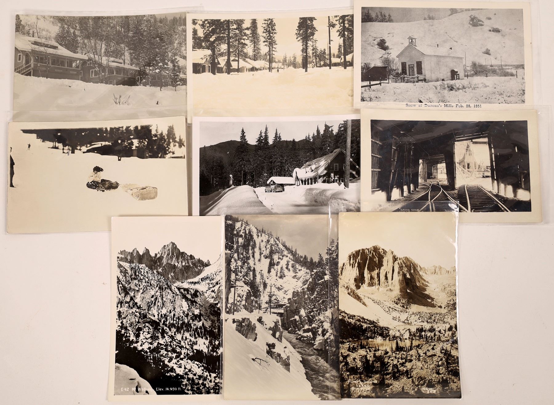 Lot of 9. 1-2) Caribou, Plumas County. 3) Snow at Duncan's Mill. 4) Mt. Whitney. 5) Sledding at Truckee. 6) Big Pine. 7) Silver Springs. 8) Snow Shed Camp. 9) Unidentified. 8 are RPC's.