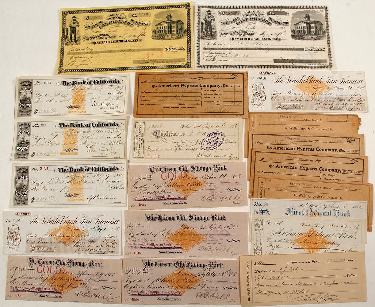 Aprrox 25 interesting checks-includes 6 Beatty, NV 1914 to American Express Co and Wells Fargo and Co. 1878 Carson City Savings Bank, Nevada 1883 State Indigent Insane Fund Warrant, 1869 Bank of California, 1866 receipt J. Goldman and Co. Tulare, CA (Potter Collection) HWAC# 59725 Date: c 1869-1914 Location: California and Nevada