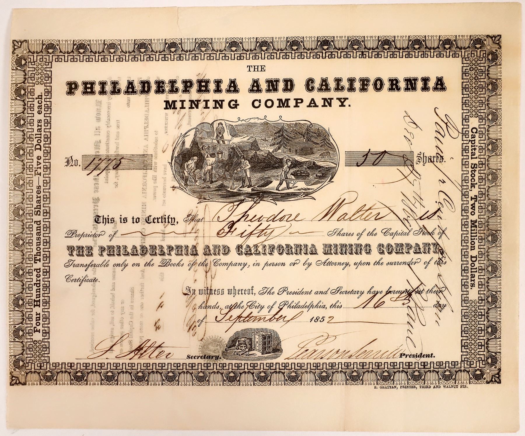Philadelphia and California Mining Company of Mariposa County. # 1775 for 50 shares to Theodore Walter. Signed by secretary l Alter and president Pearson Sierra. Black border on white paper 7 in. X 10 in. The center vignette is of miners working on a rock face on a hillside with log cabin and pine trees in background and a the bottom center is a dog and safe. The Philadelphia and California Mining Company was one of three mining ventures that was "hands-on" for John C. Fremont. At one time Fremont was acutally the presdient. (Holabird 2000, p.91). Light fold upper left and small rip upper left. Otherwise in very fine condition. Many of this stocks are unissued!!! Mariposa California 1852