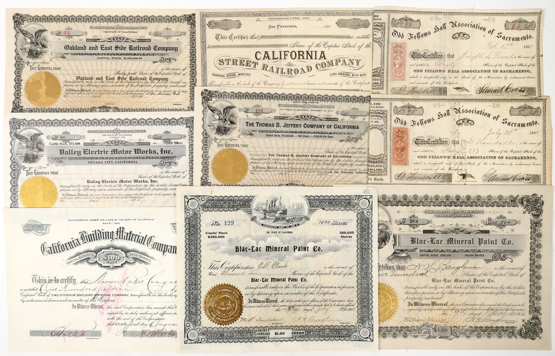 A group of nine stock certificates from various California companies, dating from the 1860s to the 1930s. The companies represented in the lot include railroads, social organizations, a paint company, and a motor works company. Five are unissued; four are issued, and of these, one is cancelled. Several have interesting engraved vignettes. All are in good condition.