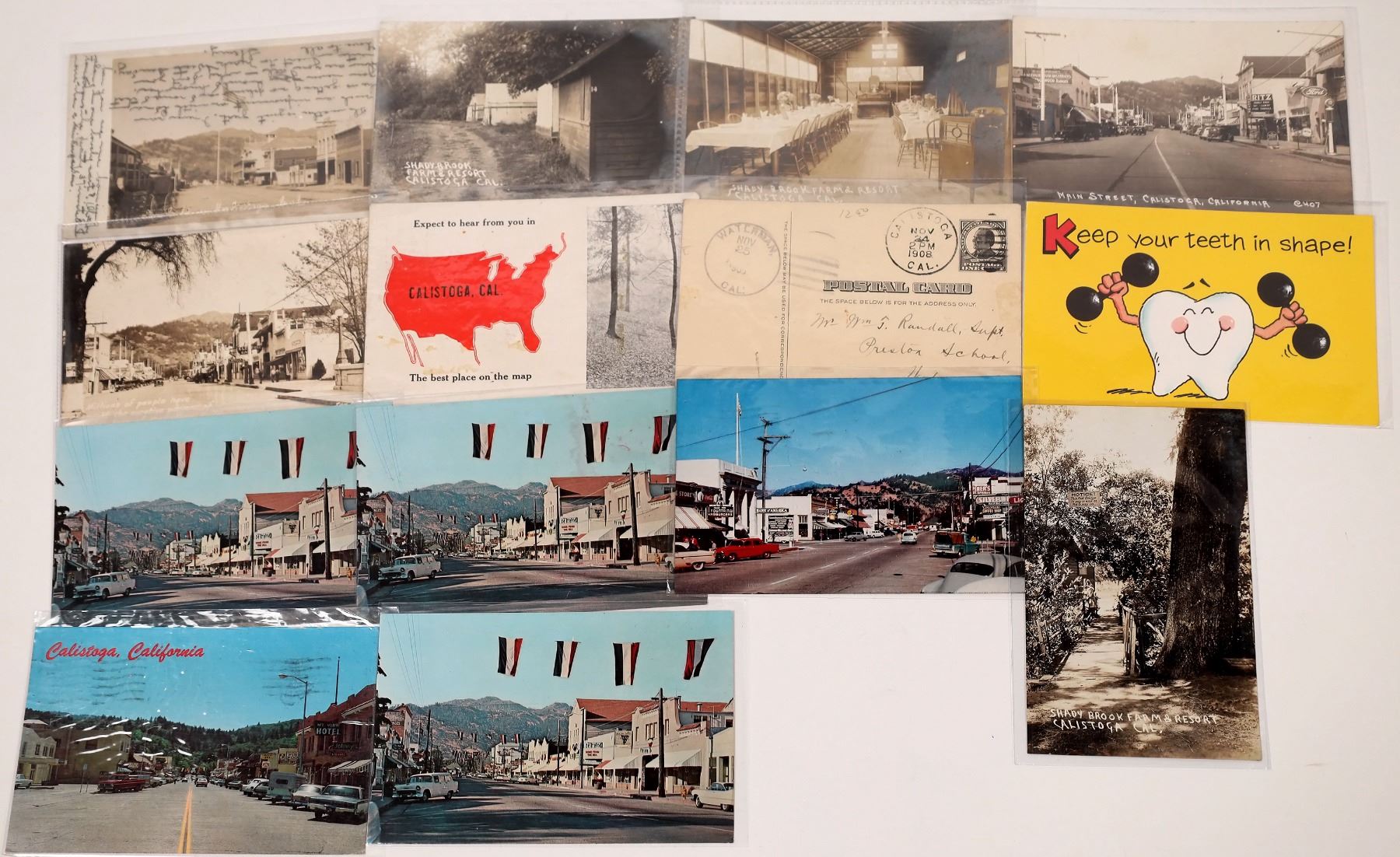 Lot of 14. 1) Six real photo postcards: three different for Shady Brook Farm & Resort; choice Calistoga street scene with wagons, 1907; and two Calistoga street scenes with automobiles (c.1940s). 2) Eight miscellaneous Calistoga postcards, 6 modern chrome, 2 earlier divided back.