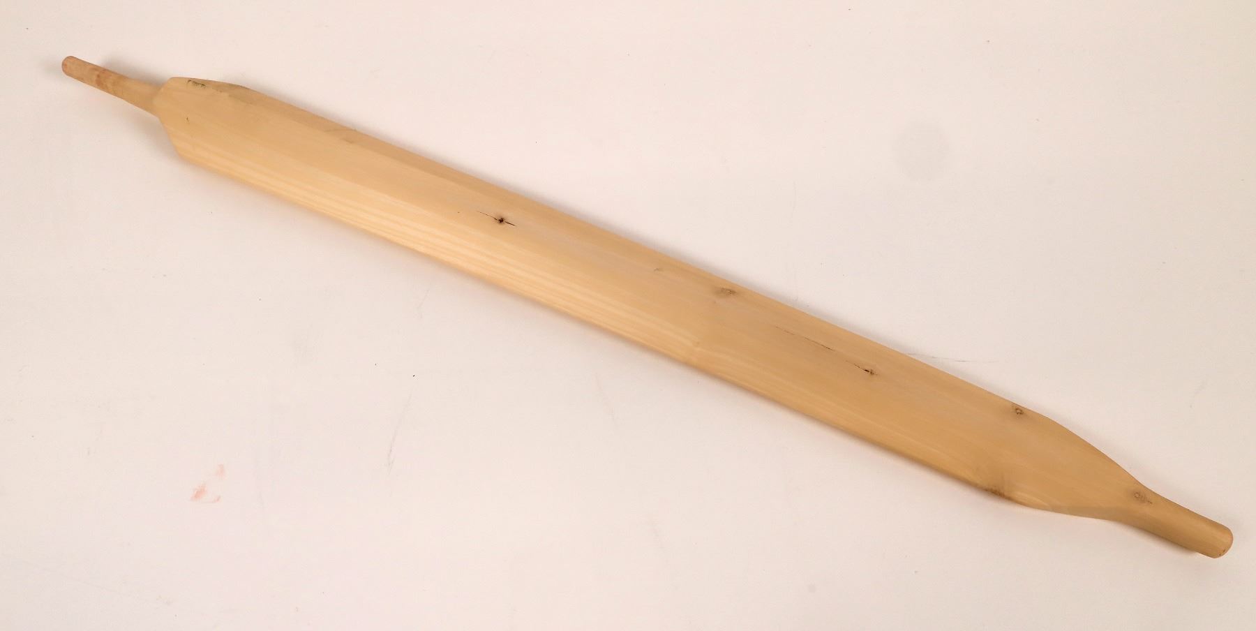 This is a peace pipe owned by Walking Bull, Sioux. At 23.5 in. with six facets. Made of a straight grained hardwood. Made on the Sioux reservation.