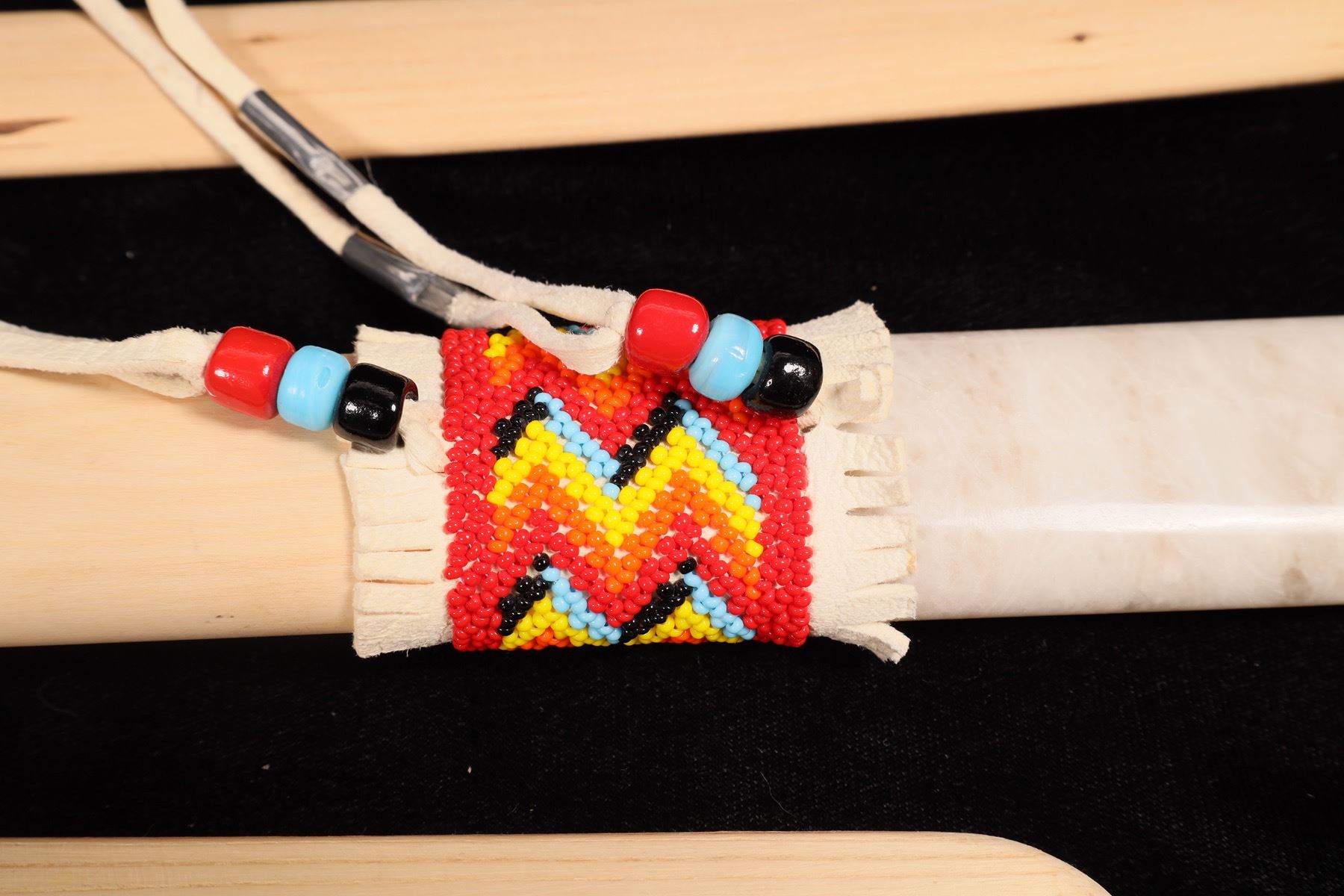 Lot of 3 pipe stems: 1.) This peace pipe or calumet is 21 in. long with an alabaster mouthpiece. It has a deerskin beaded wrap near the mouthpiece covered in red, orange, yellow, black, and blue seed beads. Oval shaped. 2.) hardwood 17 in. long. It is oval shaped and rounded at the mouthpiece. Lightly oiled finish. 3.) 20 in. with a slight bow, hardwood, and a light oil finish. It is oval shaped without a separate mouthpiece. All made on the Sioux reservation. South Dakota