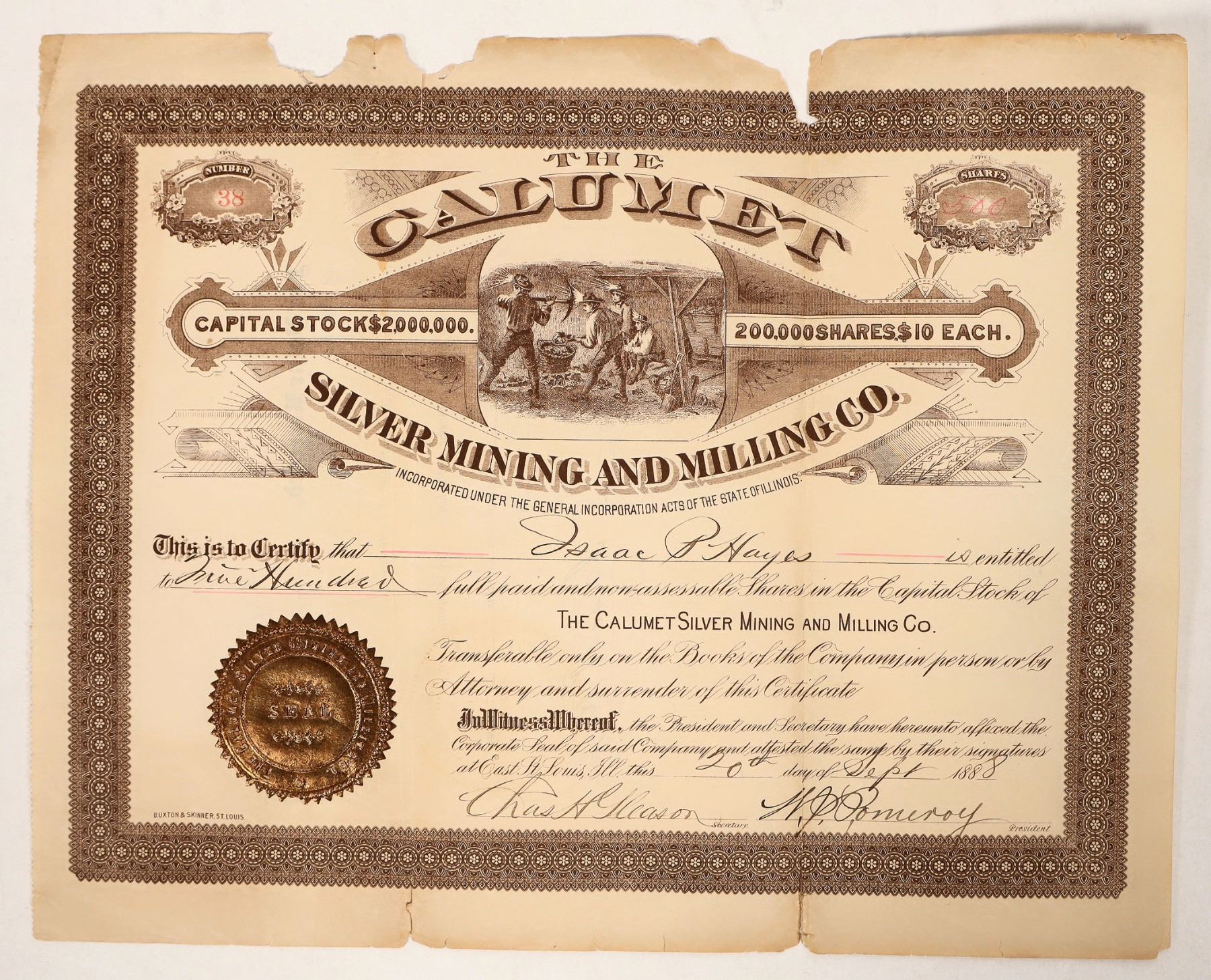 Not in Filer or other Holabird indexes. Inc. in Illinois. No. 38, issued for 500 shares to Isaac B. Hayes on Sept. 20th, 1888. Signed by president William J Pomeroy and secretary Chas. Gleason. Not cancelled. Brown border and print, gold seal, vignette of 4 miners working underground. Printed by Buxton & Skinner, St. Louis. Heavy folds with separation, pieces torn off, areas of heavy toning. Please inspect. 9.5 x 12" Could not be located. Others have argued it is a Colorado mine, noting that the Acacia Mining Co. of Cripple Creek absorbed a Calumet MC, but 1888 would be too early for Cripple Creek. Searches on newspapers.com only turned up one mention of the incorporation in 1888, but no location. Sold as is.