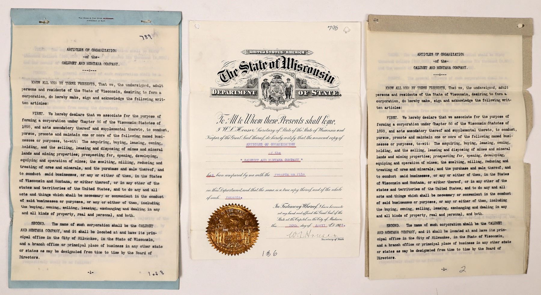2 Articles of incorporation. Calumet and Montana had 6 claims with about 120 acres, in the Copper Queen district located along the Montana Idaho border. Their stock suffered from "market rigging".