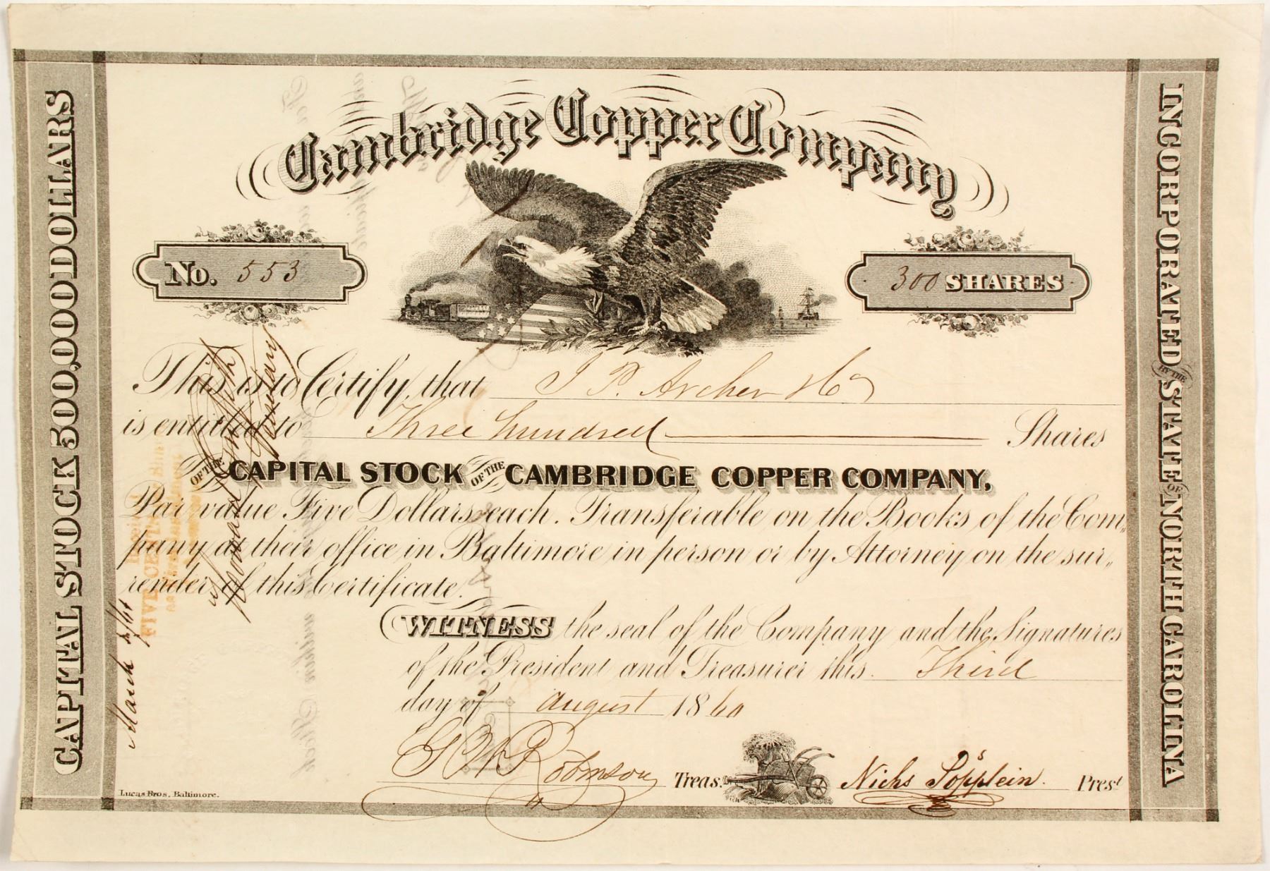 # 353 for 300 shares to JT Archer & Co. Signed by Robinson and president Nicholas Popplein. Dateline 1860. Handwritten in pen "March 1861 Howard Griffith Secretary." Assessment receipt. Not cancelled. Eagle vignette. Lucas Brothers printer. No edge, corner or discoloration issues. Located 7 miles from Greensboro. 1/2 mile from Greensboro Railroad. Prag Collection State: North Carolina City: Gilford County Date: 1860 HWAC# 81962