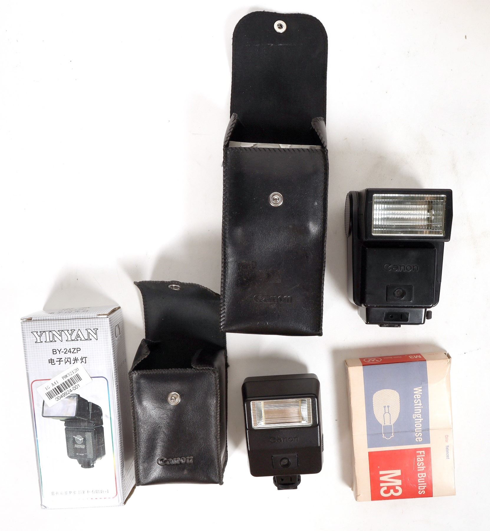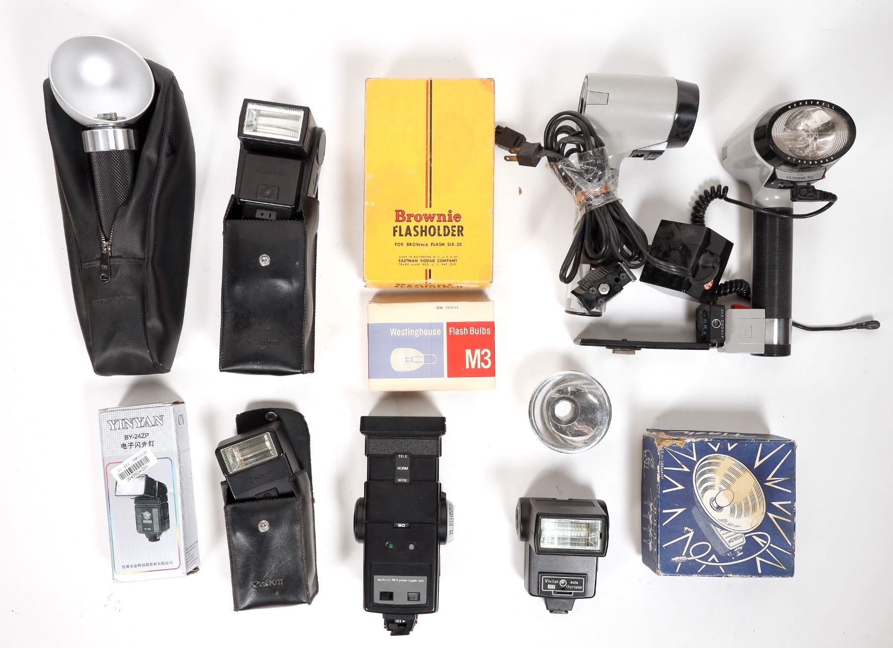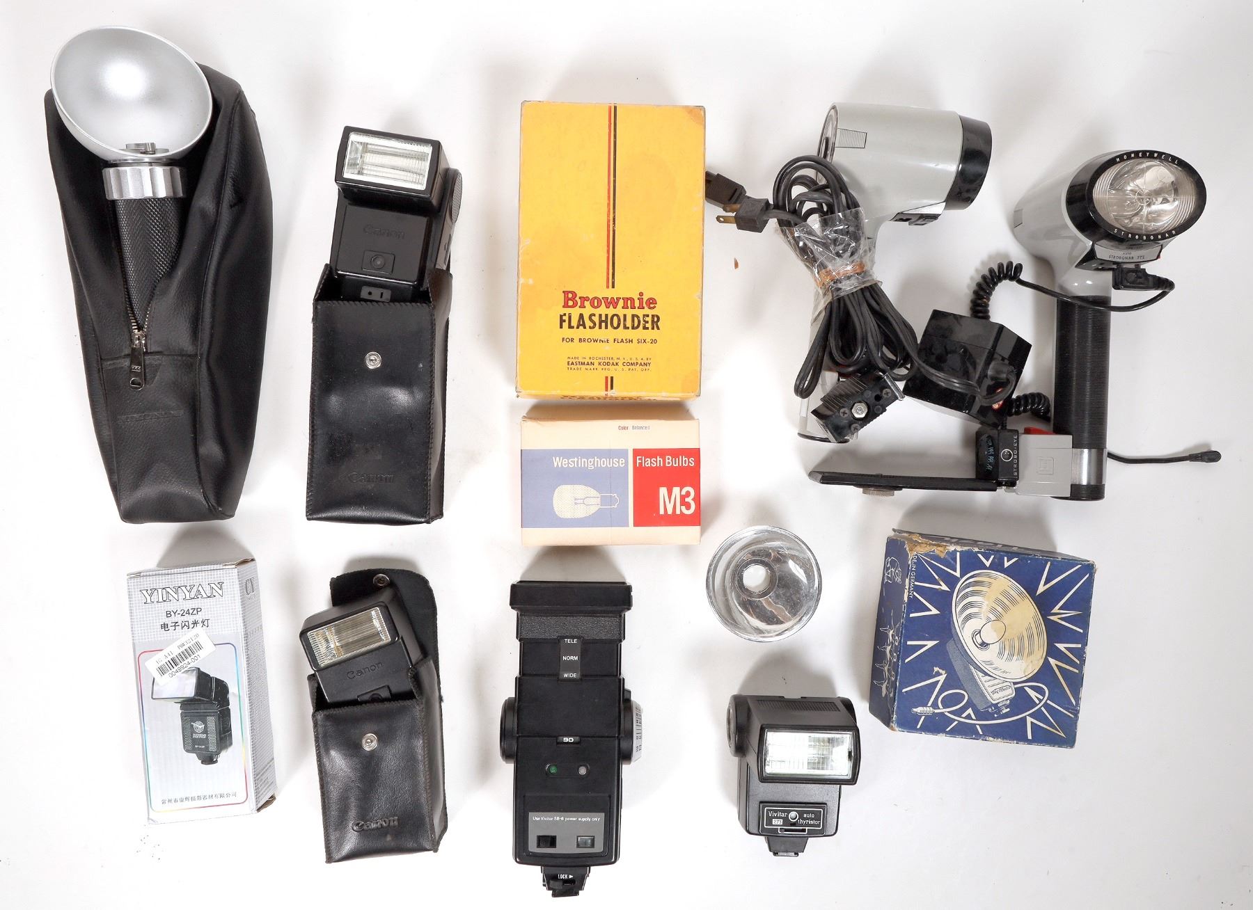 Eight flash units plus some accessories. Brownie flash holder w box; canon; vivitar; Yinyan; vivitar; Honeywell strobonar; strobonar 782; plus other. see photo