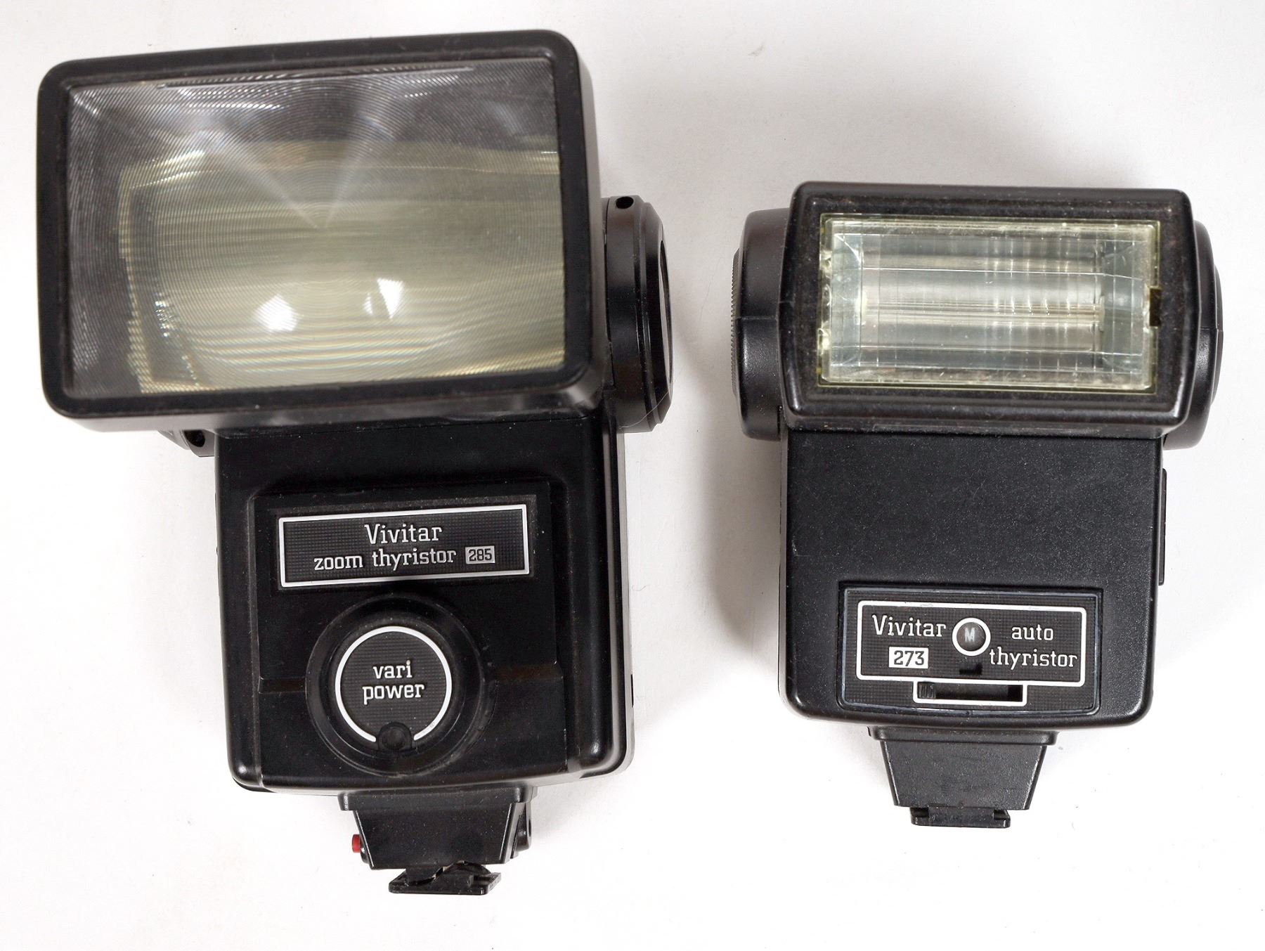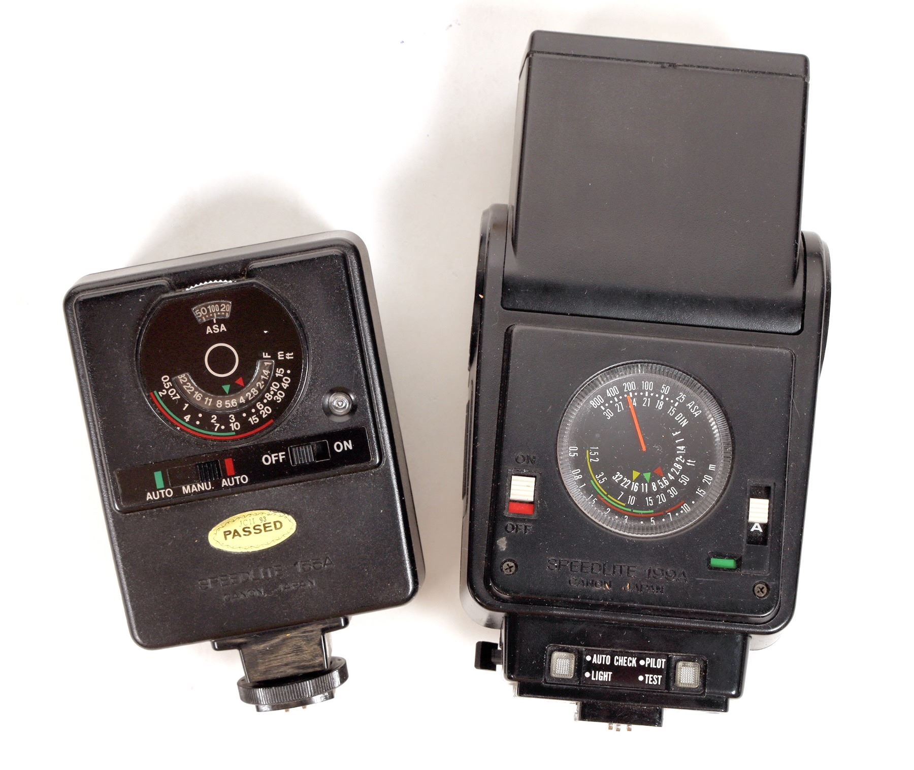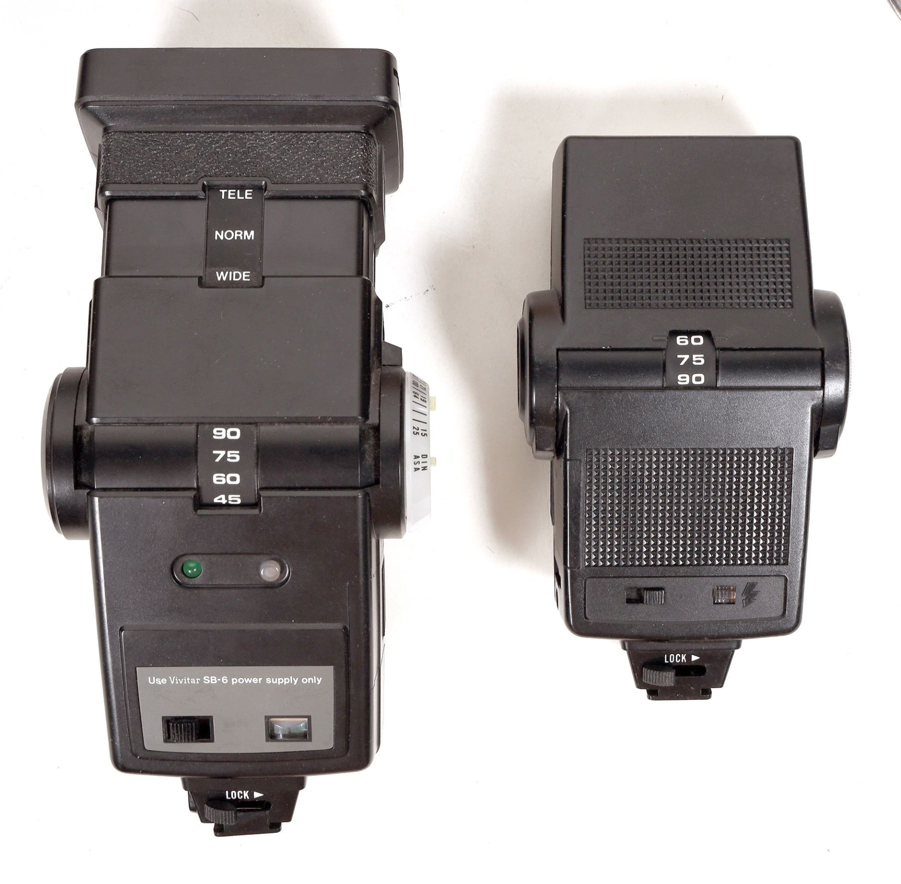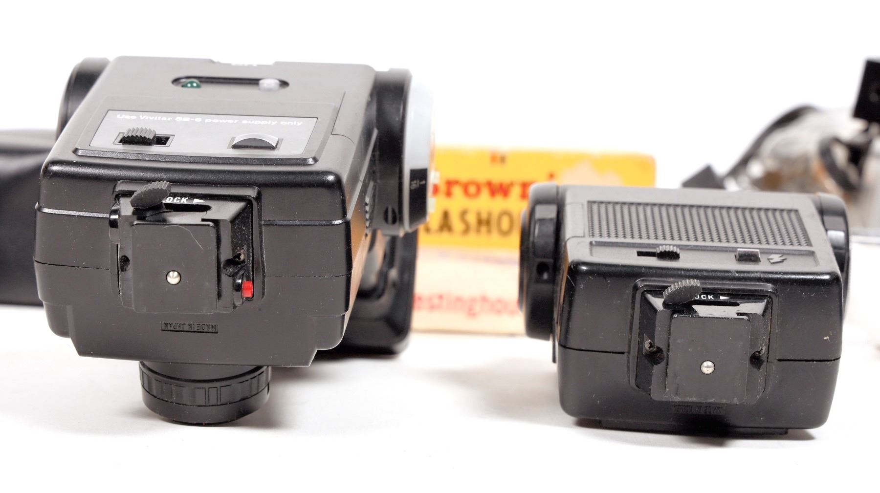 Eight flash units plus some accessories. Brownie flash holder w box; canon; vivitar; Yinyan; vivitar; Honeywell strobonar; strobonar 782; plus other. see photo
