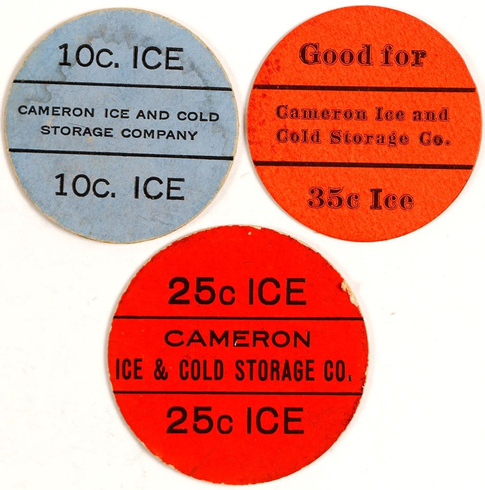 3 cardboard 35mm. Red Gf / Cameron Ice and Cold Storage Co. / 35c Ice // (illegible writing). Blue 10c. Ice / Cameron Ice and Cold Storage Company / 10c. ICE //? TEXAS. Red 25c ICE / Cameron Ice and Cold Storage Co. / 25c ICE // blank. HWAC# 62330 Date: Location: Cameron, Texas