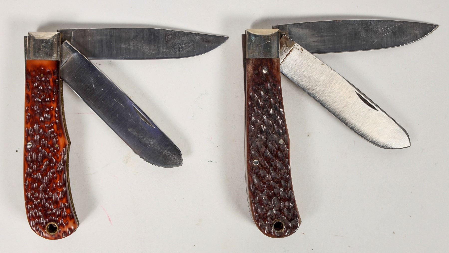 These are two Callimuss classic knives: A wildlife series Elk folder #10 without a box, and a Classic Cartridge knife in 45-70 Govt. #000-1 like new in the box. Both are trapper designs with factory edges. Please see photo for details.