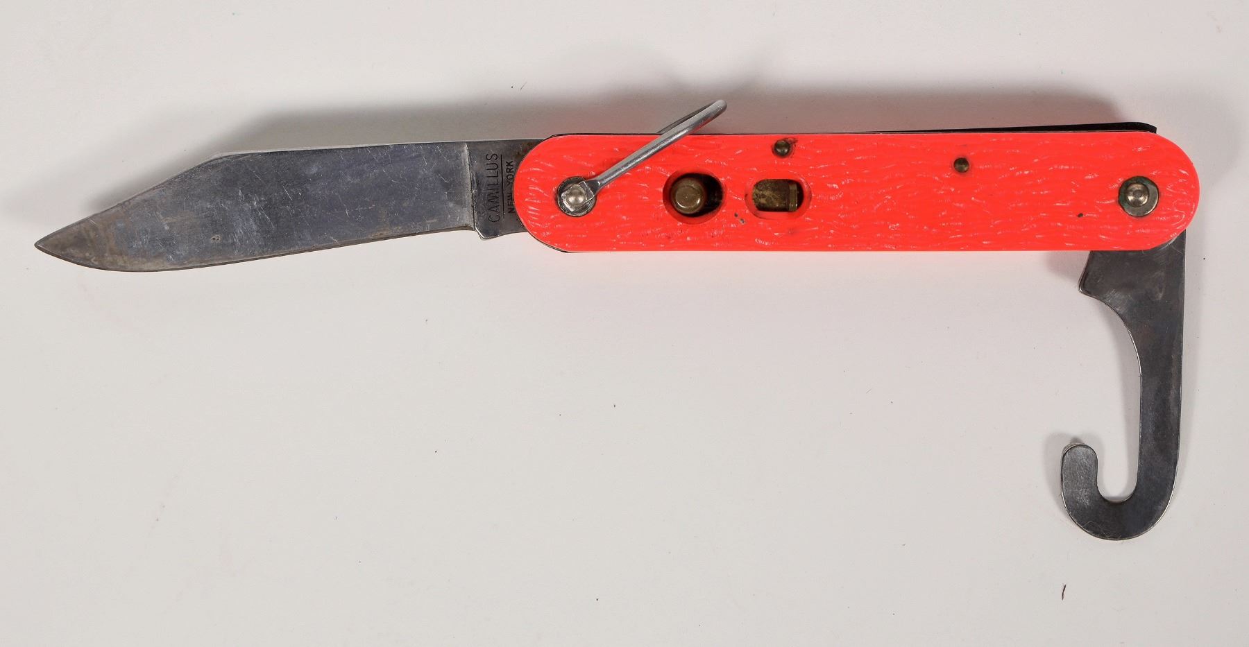 This is a Camillus assisted opening knife; originally issued to military personnel, specifically to pilots and paratroopers, as well as the NASA program. It has a spring assisted blade with a safety lock and a hook blade. The scales are orange delrin material. In very good condition. The assisted blade is a clip point; the un-assisted blade is a hook for cutting line. Please see photos for details. 4.25 in. closed, 7.375 in. open.