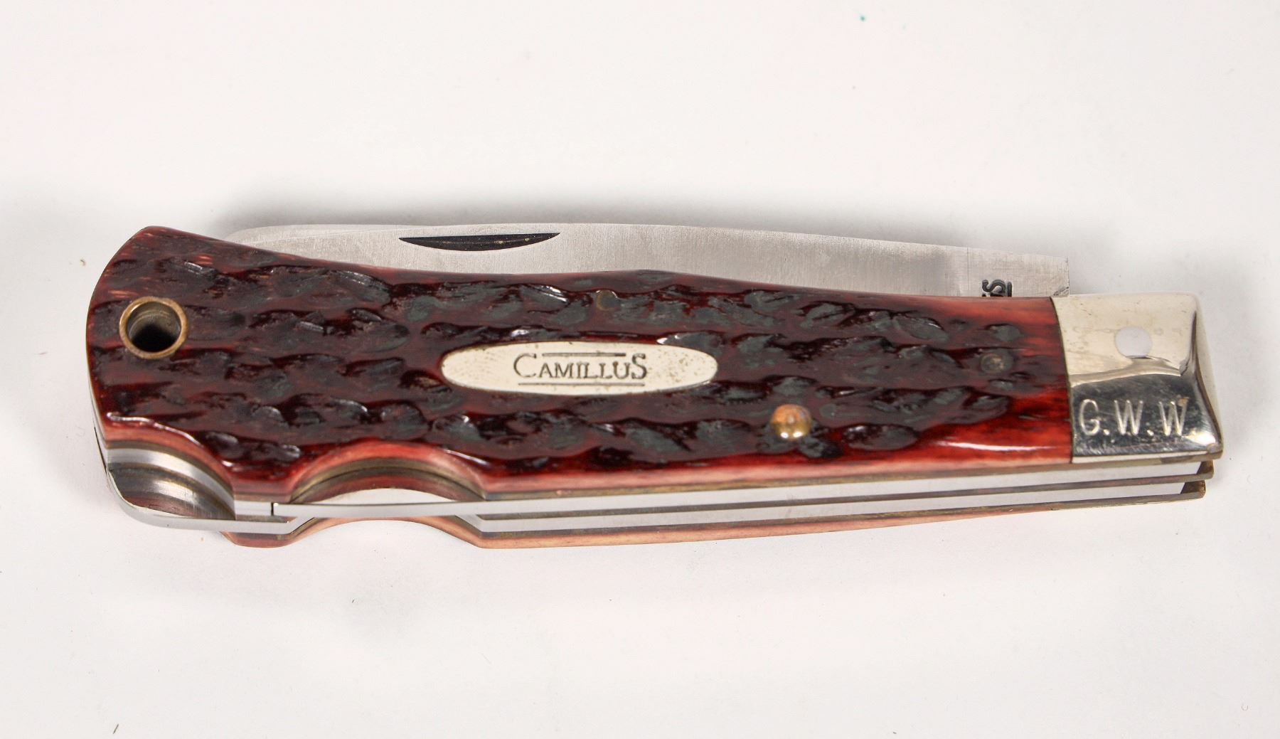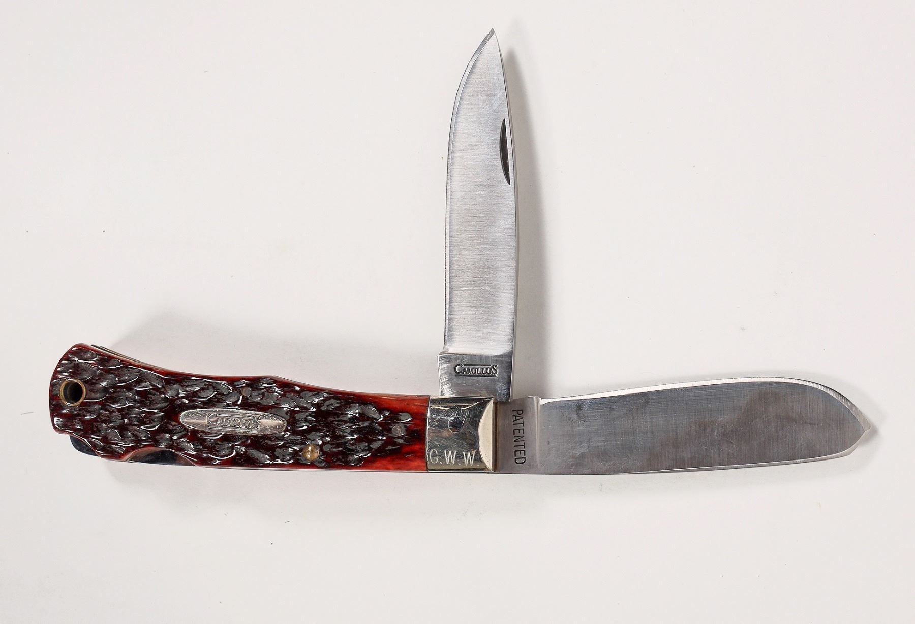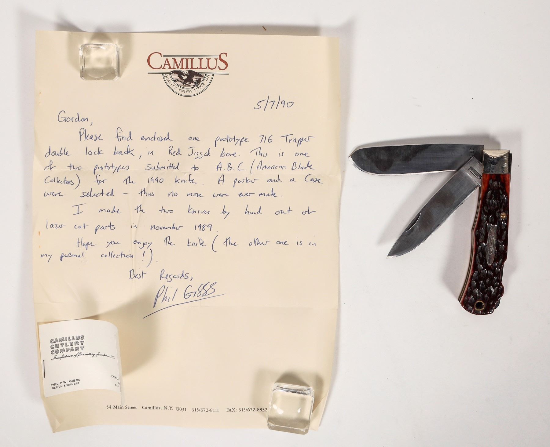 This is a prototype model 716 trapper from Camillus with dual lock back mechanisms. This one was made available to the ABC (American Blade Collectors) however was not picked for the 1990 release. The release knives were made by Parker and Case. This one is simply marked "Camillus" in the oval inlay and on the ricasso of the spear point blade but no other notation as to model number is shown. The owner's initials are scribed into the bolster as: "G.W.W." A letter from the Camillus Engineer Phil Gibbs accompanies the knife with a clear explanation. This is a unique knife with two thumb cut-aways to compress the lock backs. 4.5 in. closed and 8 in. open with 3.5 in. blades (these may be unique numbers from the 716 model). Red jigged delrin. Like new condition, no box. Please see photos for details.
