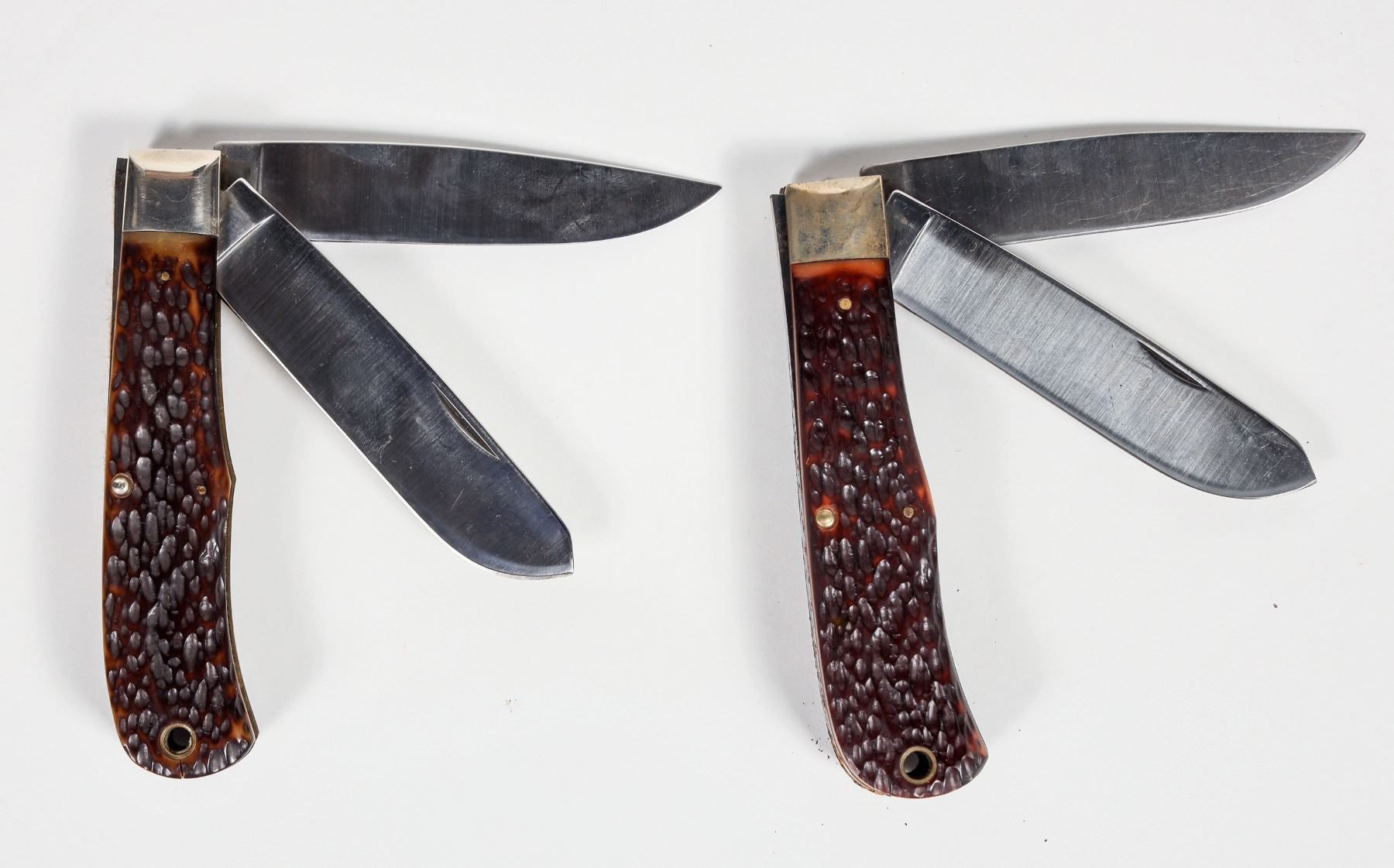 There are two Camillus Wildlife series knives: the Pronghorn Antelope without a box, and the running bear with box in poor condition due to moisture damage. The Antelope knife has hairline cracks at the lanyard tube. Please see photo for details.