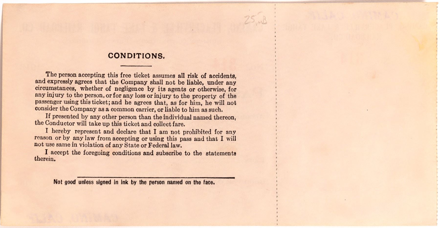 Unused 1913 pass. For one trip only. #314. The Camino, Placerville and Lake Tahoe Railroad was an 8-mile (13 km) Class III short-line railroad operating in the Sierra Nevada in California, east of Sacramento. It was built primarily to haul lumber from the El Dorado National Forest. The standard gauge line ran west 8.05 miles from a sawmill at Camino to a connection with the Placerville Branch of the Southern Pacific Company at Placerville. Loaded cars of lumber descended a 3.5 percent grade from 3,150 feet at Camino to 1,900 feet at Placerville. We don't find items from this road very often! State:California City:Placerville Date:1913 Provenance: