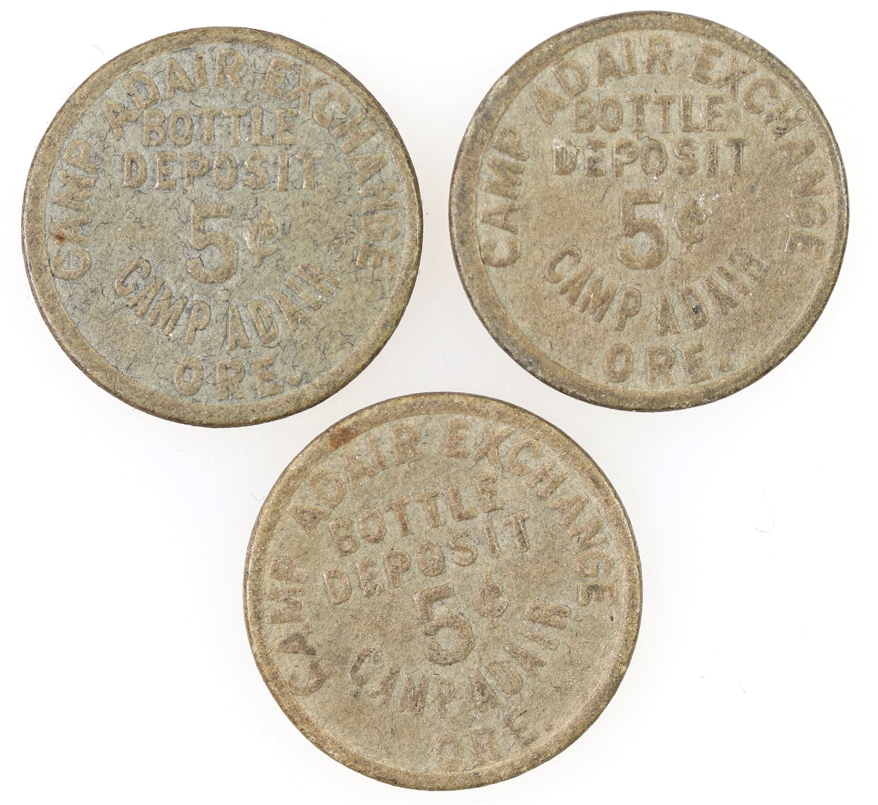 Three tokens from the Benton County location: CAMP ADAIR EXCHANGE / BOTTLE / DEPOSIT / 5¢ / CAMP ADAIR / ORE. // CAMP ADAIR EXCHANGE / BOTTLE / DEPOSIT / 5¢ / CAMP ADAIR / ORE. (no comma after DEPOSIT or ADAIR). Named for Henry R. Adair, a training camp in World War Two, discontinued in 1946.