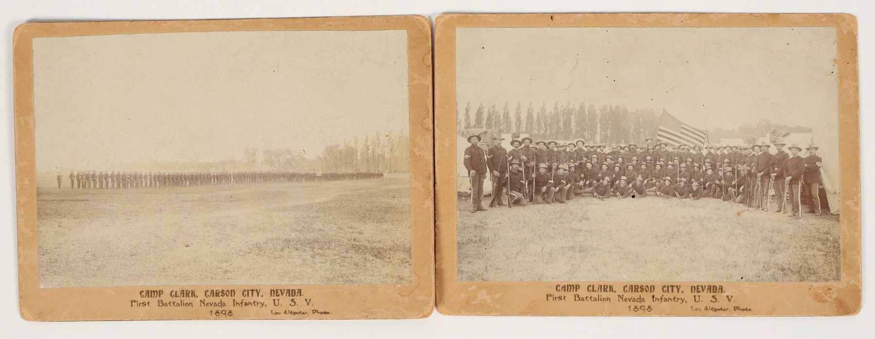 Lot of 2 cabinet card sized photos (5 x 7") of soldiers identified Camp Clark, Carson City, Nevada, First Battalion Nevada Infantry, USV, 1898. Photos by Lou Alexander. Camp Clark in Carson City, Nevada, was a short-lived military post established in 1898 during the Spanish-American War as a muster and training camp for Nevada volunteer troops. Named after Governor Reinhold Sadler's adjutant general, it housed the 1st Nevada Infantry Regiment before their deployment to the Philippines. Though active for only a brief period, it represented Nevada's contribution to national mobilization and left a small but notable imprint on Carson City's late 19th-century history.