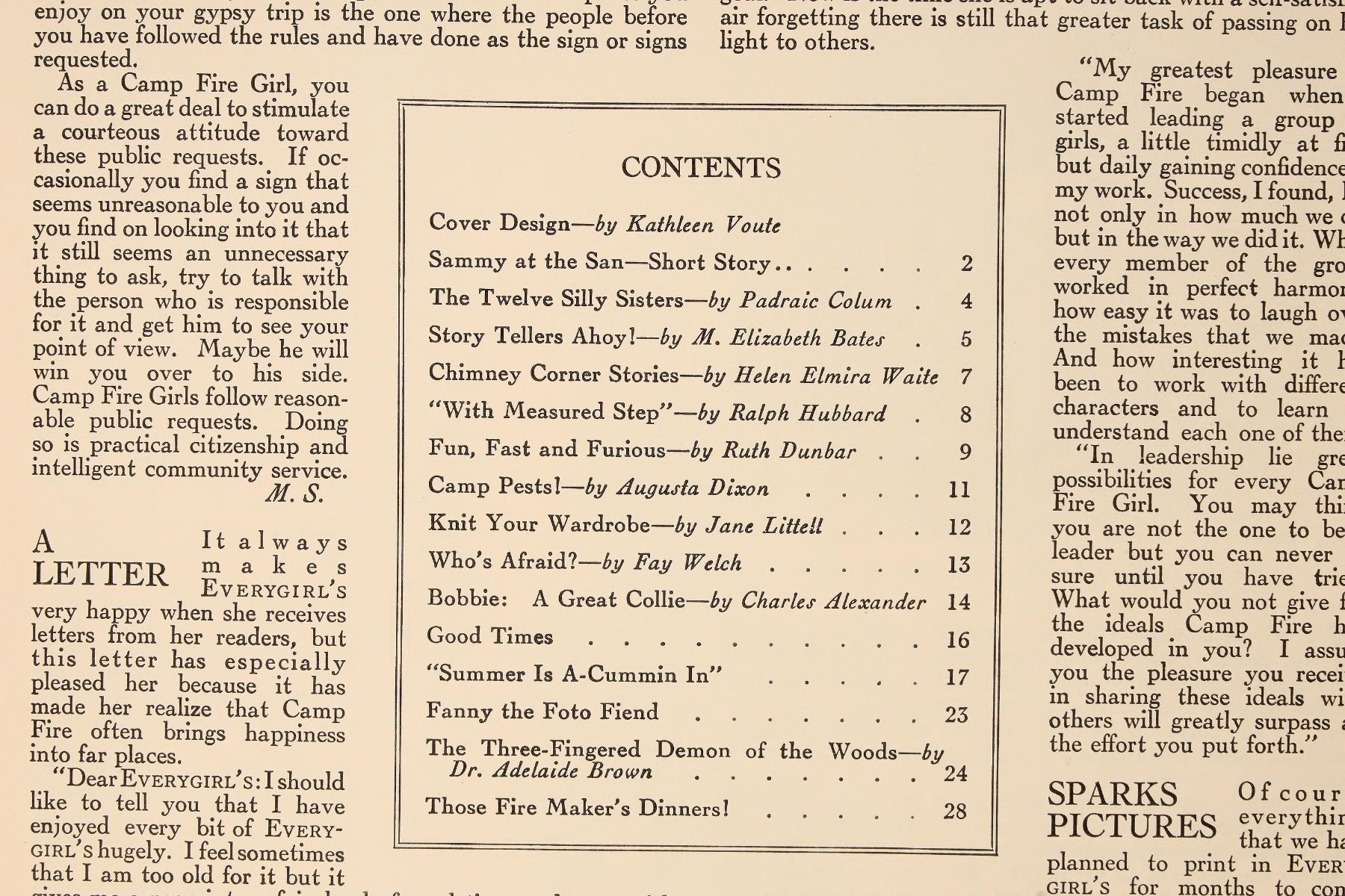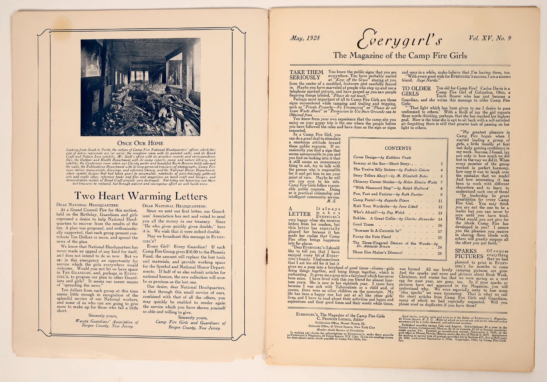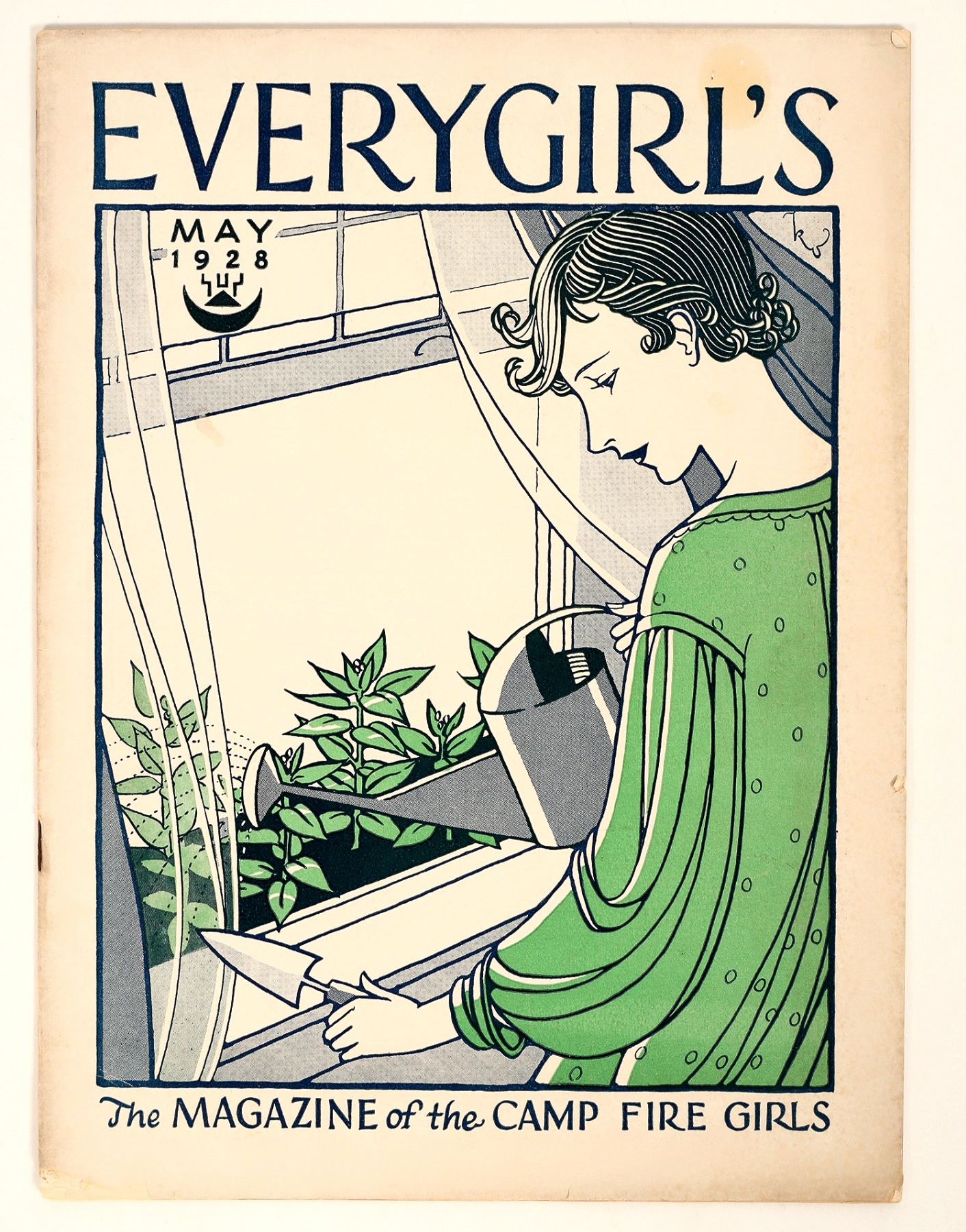 Everygirl's. "The Magazine of the Camp Fire Girls," May 1928 issue. 32 pp. Lead story is about a girl who learned to live without her French maid. Other subjects include: how to become a storyteller, how to make moccasins, identifying poisonous snakes, knitting, games to play at camp, Fire Maker's dinner recipes, etc. Spine wear top & bottom, light foxing on front cover, otherwise good.
