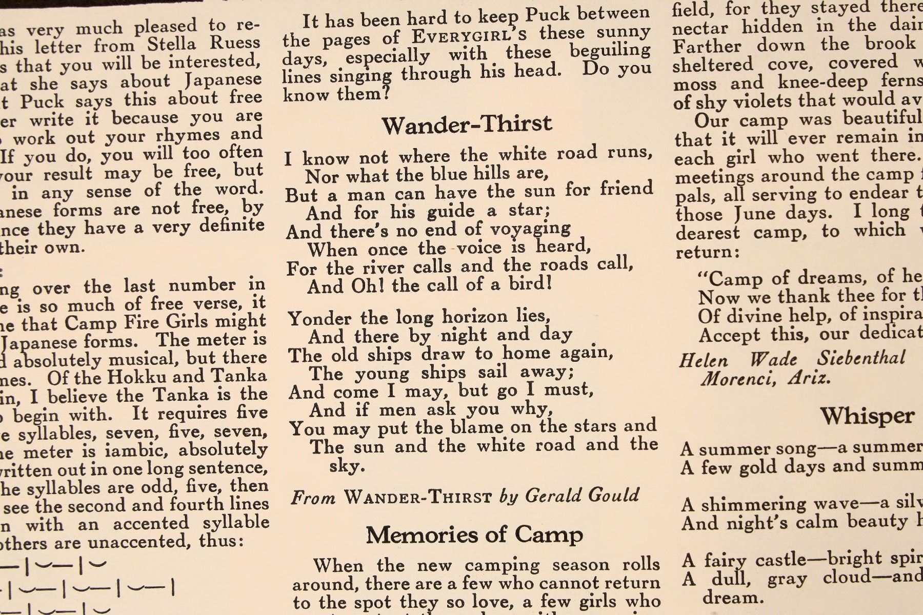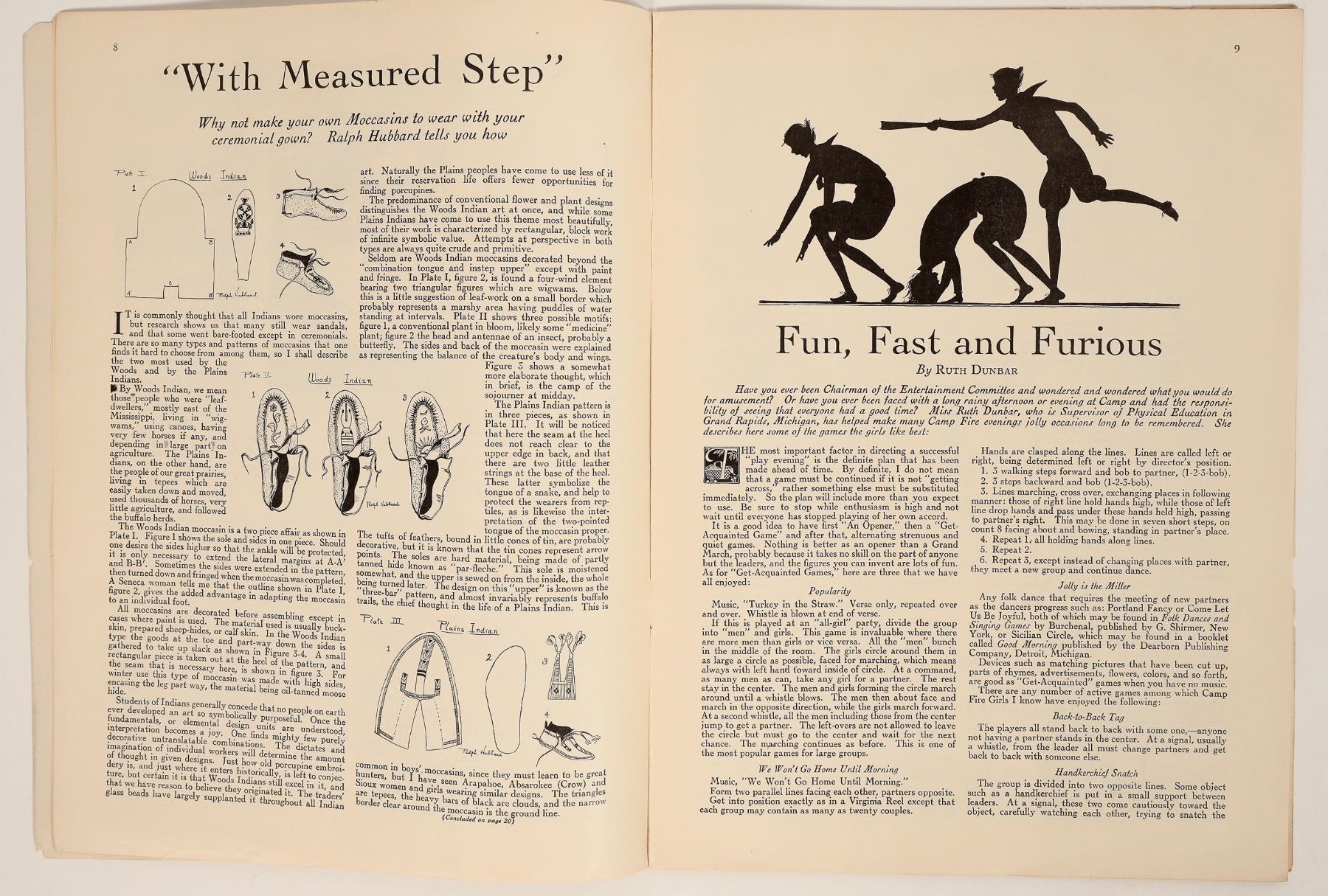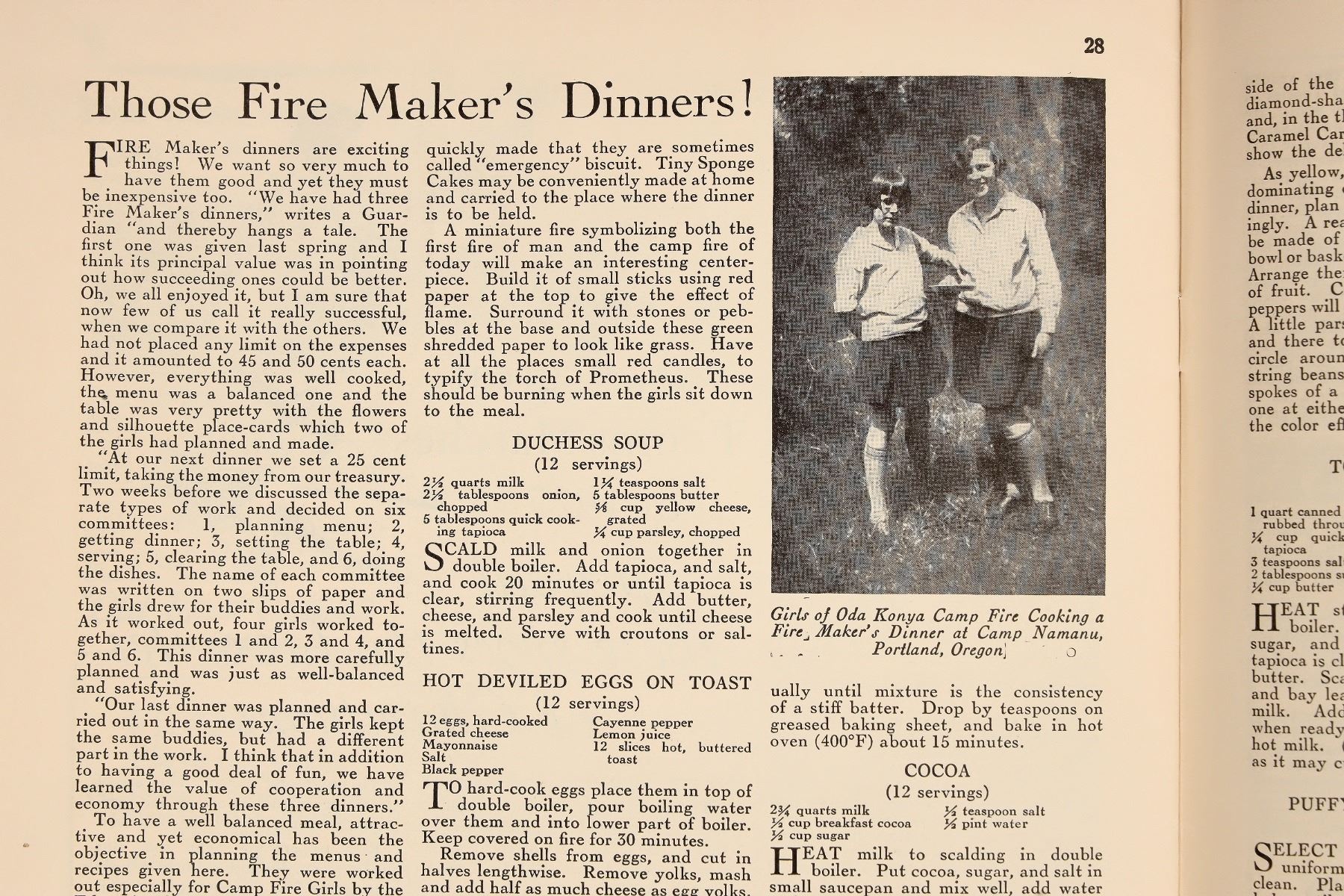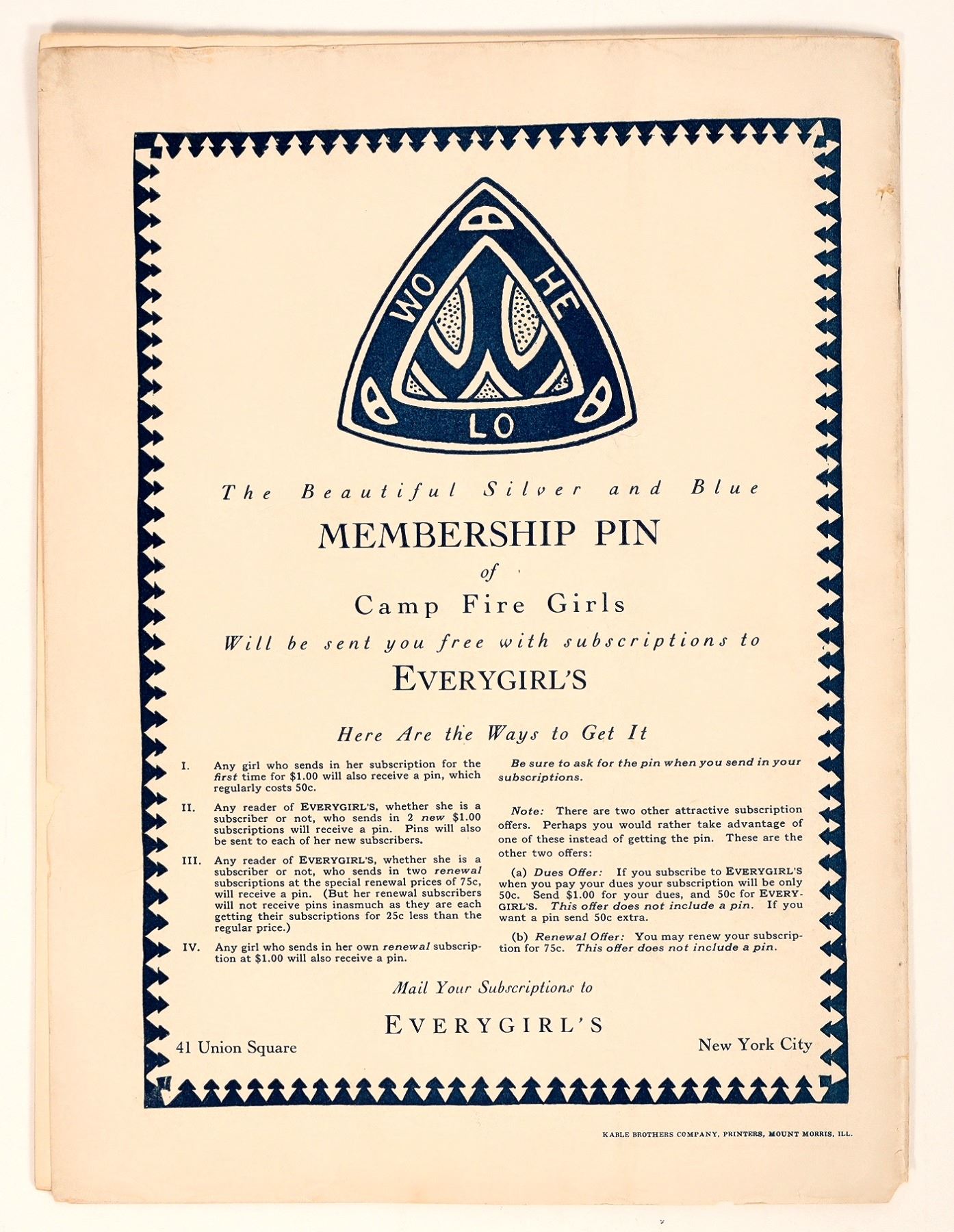 Everygirl's. "The Magazine of the Camp Fire Girls," May 1928 issue. 32 pp. Lead story is about a girl who learned to live without her French maid. Other subjects include: how to become a storyteller, how to make moccasins, identifying poisonous snakes, knitting, games to play at camp, Fire Maker's dinner recipes, etc. Spine wear top & bottom, light foxing on front cover, otherwise good.