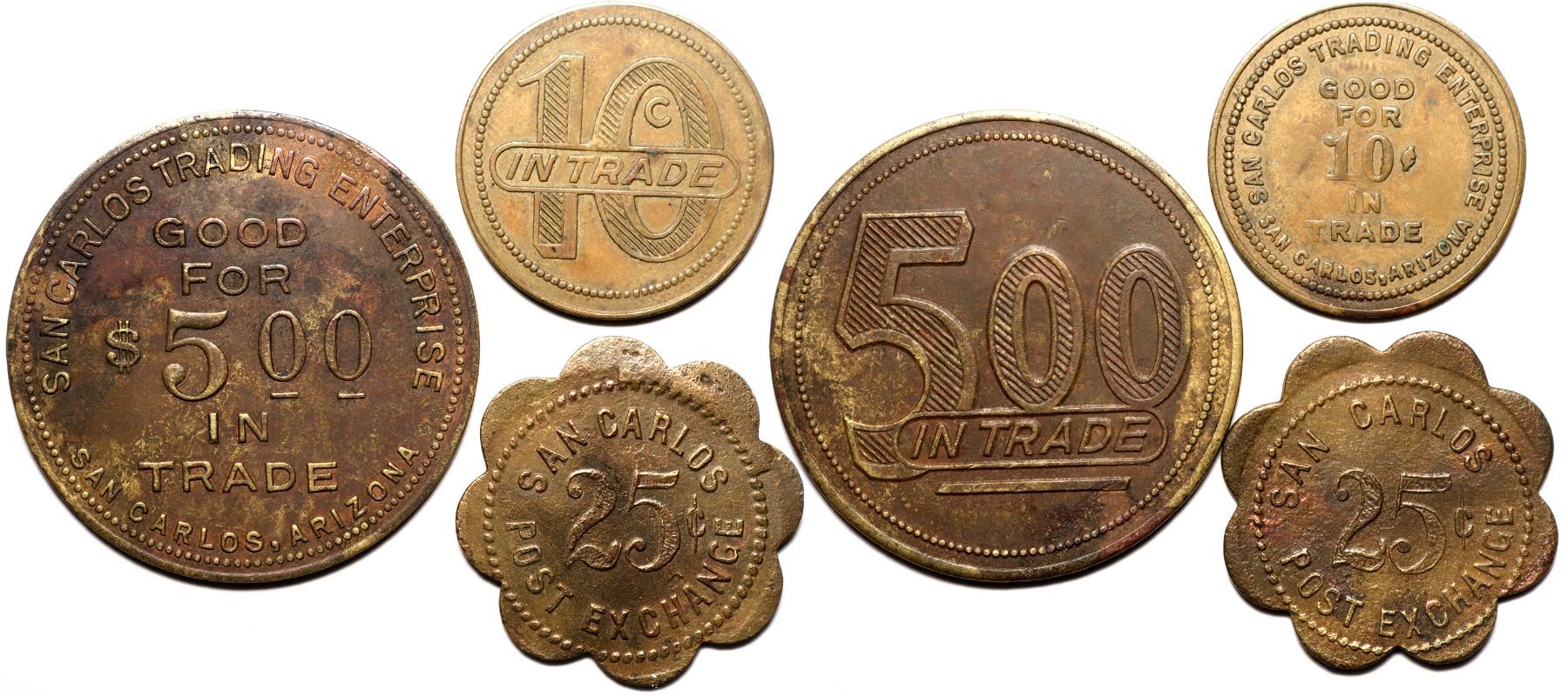 1) San Carlos Trading Enterprise / Good for $5.00 in trade/ San Carlos , Arizona// 5.00 IT. Round, brass, 2".