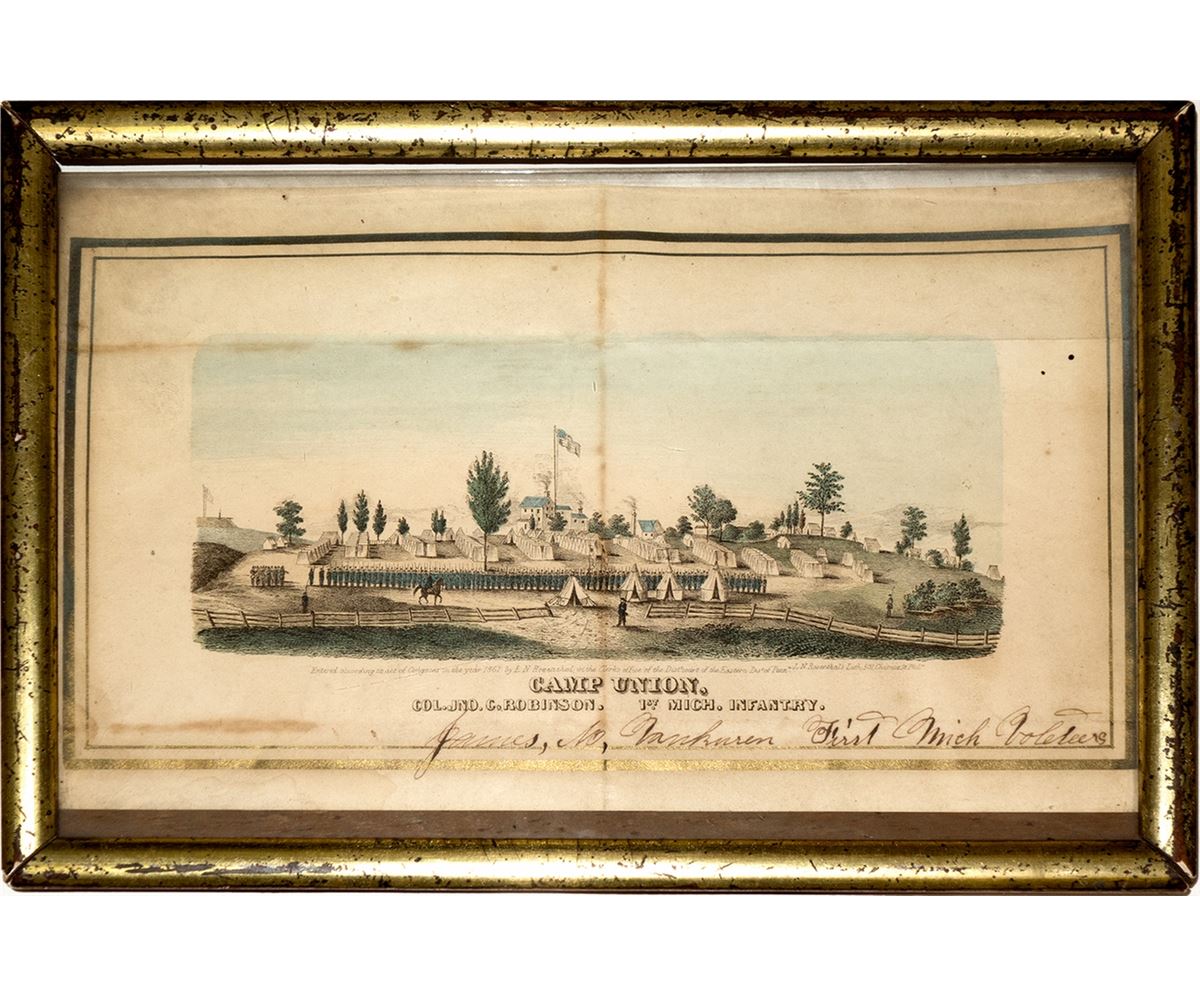 Entered according to act of Congress in the year 1861 by L.N. Rosenthal, a lithographer in Philadelphia. Caption reads: "Camp Union/ Col. Jno. C. Robinson. 1st Mich. Infantry." Underneath has signature of "James Parkinson (?), First Mich. Voleteers." Measures 6.5" x 10.75." In antique frame that needs to be replaced. Deep vertical and horizontal folds with light soiling. Gilt border. Attractive view of camp with tents, Union soldiers, and structures with American flag. Camp Union was located near Philadelphia and served as a military training center from 1861-1865.