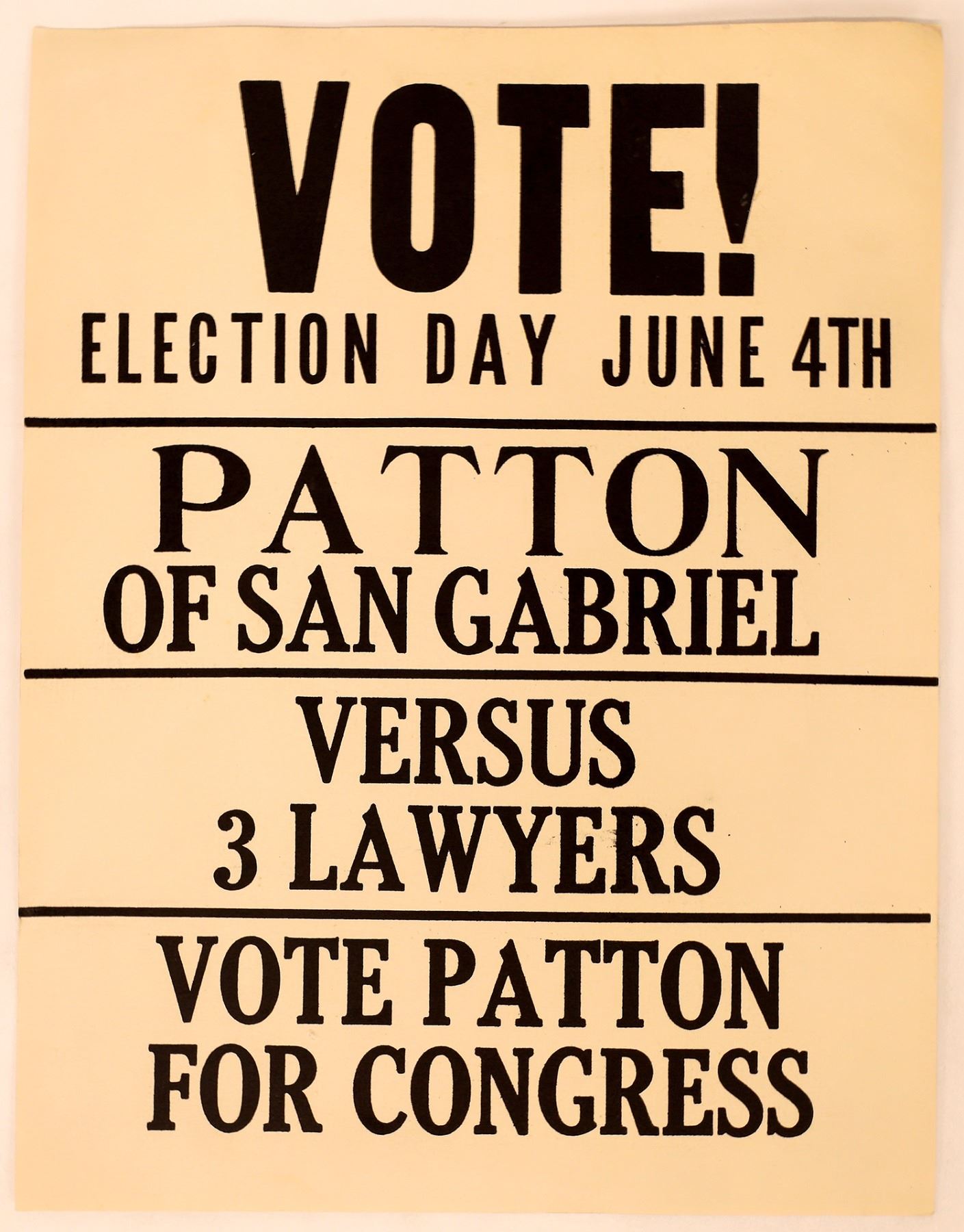 In 1894 George Smith Patton ran for Congress, he lost. Not only was he the father of future WWII General George S. Patton, but he served as the first mayor of the town of San Marino. He was also close friends with philanthropist Henry E. Huntington, his neighbor. The sign is in excellent condition and ready to be matted and framed. This is a must for any military buff. Please see photos for more details. [San Marino] [California]