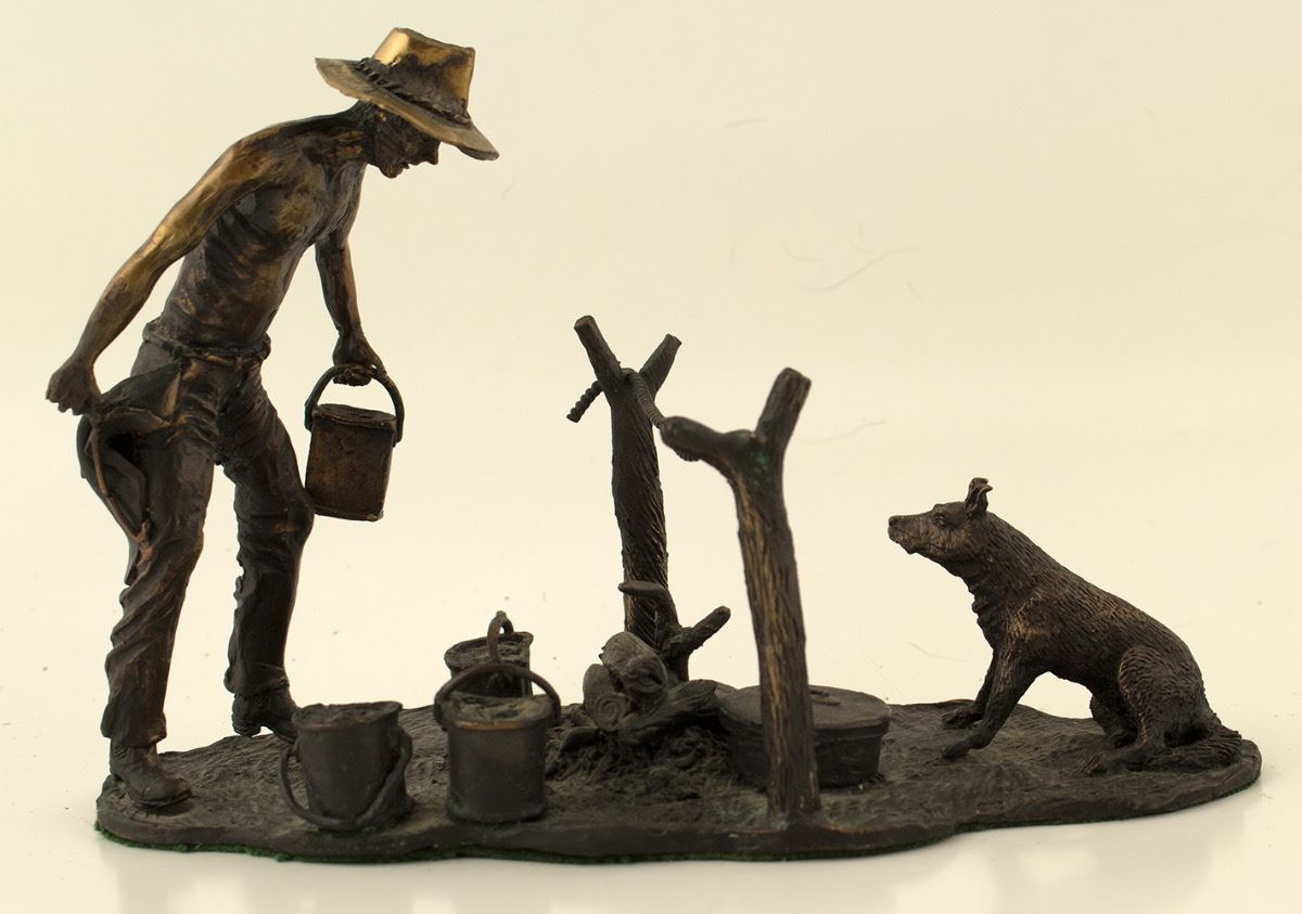 Bronze sculpture, "campfire". Bucket in hid hand is loose, made that way. By acclaimed outback sculptor, Eddie Hackman (1933-2011). Born in China of Scots-Scandinavian parents, Eddie Hackman arrived in Australia in 1953 after being educated in Arts in Scotland. He entered the stock and droving camps of the Northern Territory in the days of open range grazing on immense holdings of thousands of square miles in size and witnessed the introduction of fencing and the eventual end of an era before returning to a vocation in sculpture. City: State: zAustralia Date: hwac# 35346