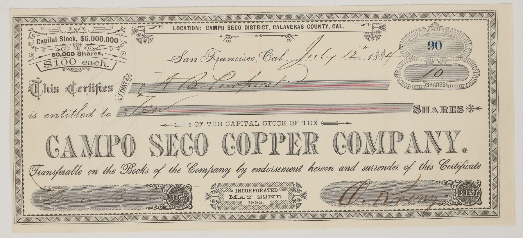 "Location: Camp Seco District, Calaveras County, Cal." printed at top center. No. 90, issued in 1884. Not cancelled. Folds. Campo Seco, which means "Dry Camp" in Spanish, was originally a gold mining town before copper was discovered in 1859.
