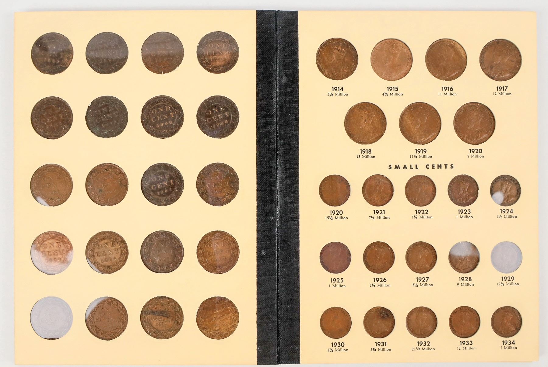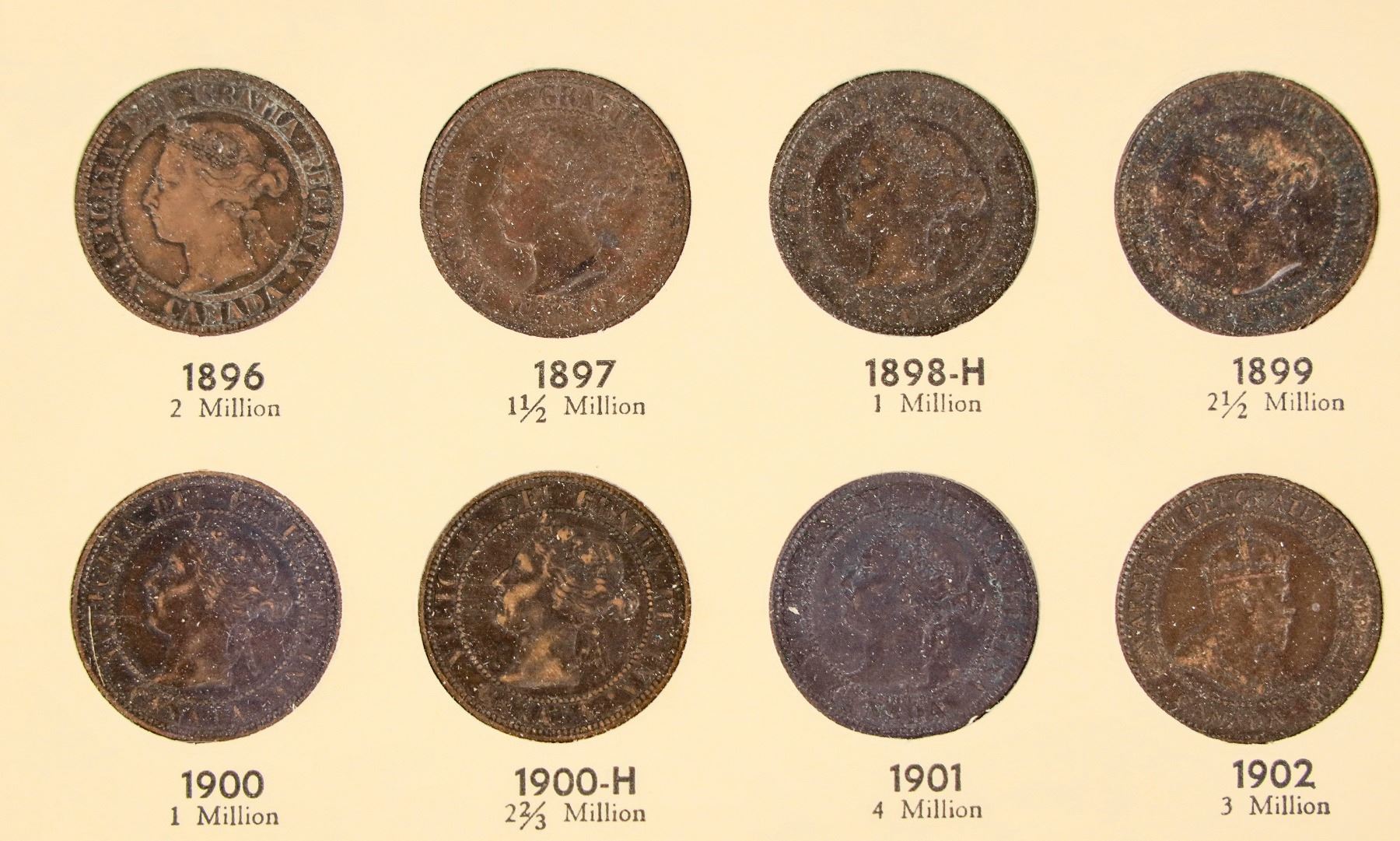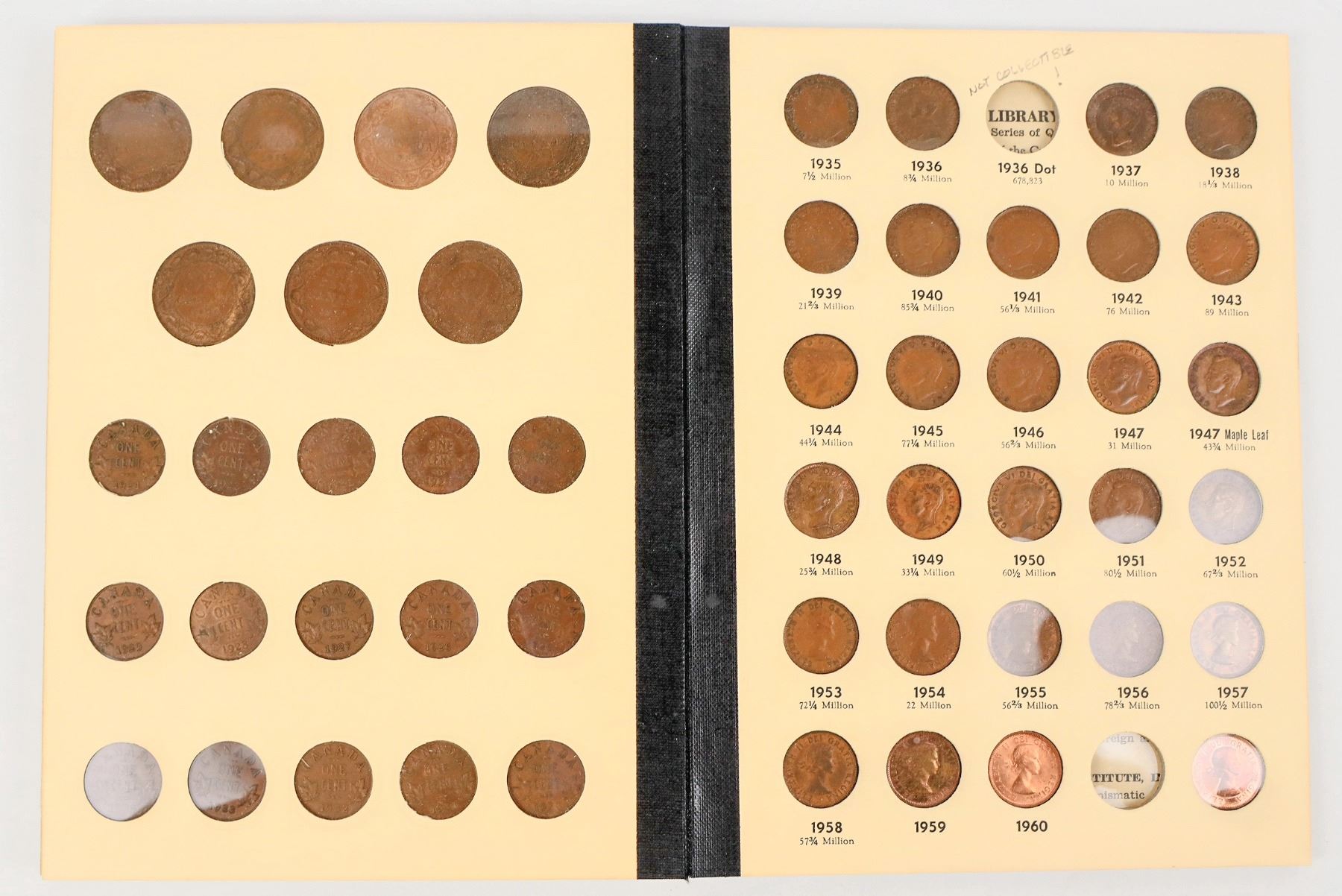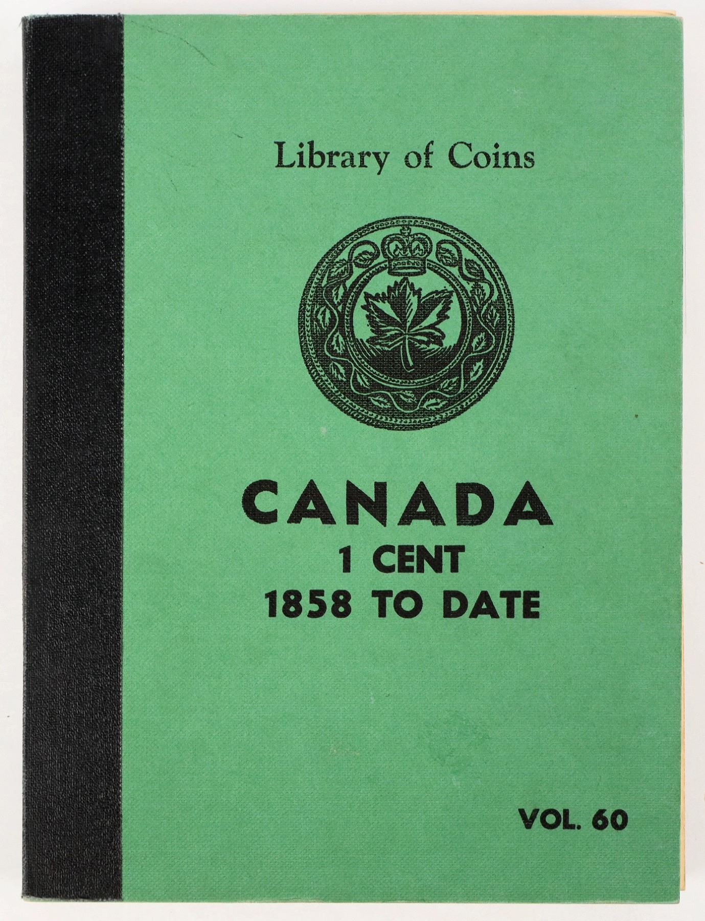 Library of Coins green album Volume 60, copyright 1959. Canada one cent coins from 1858 through 1960, missing only the 1936 with dot. 90 coins total; dates and mint marks have not been verified.