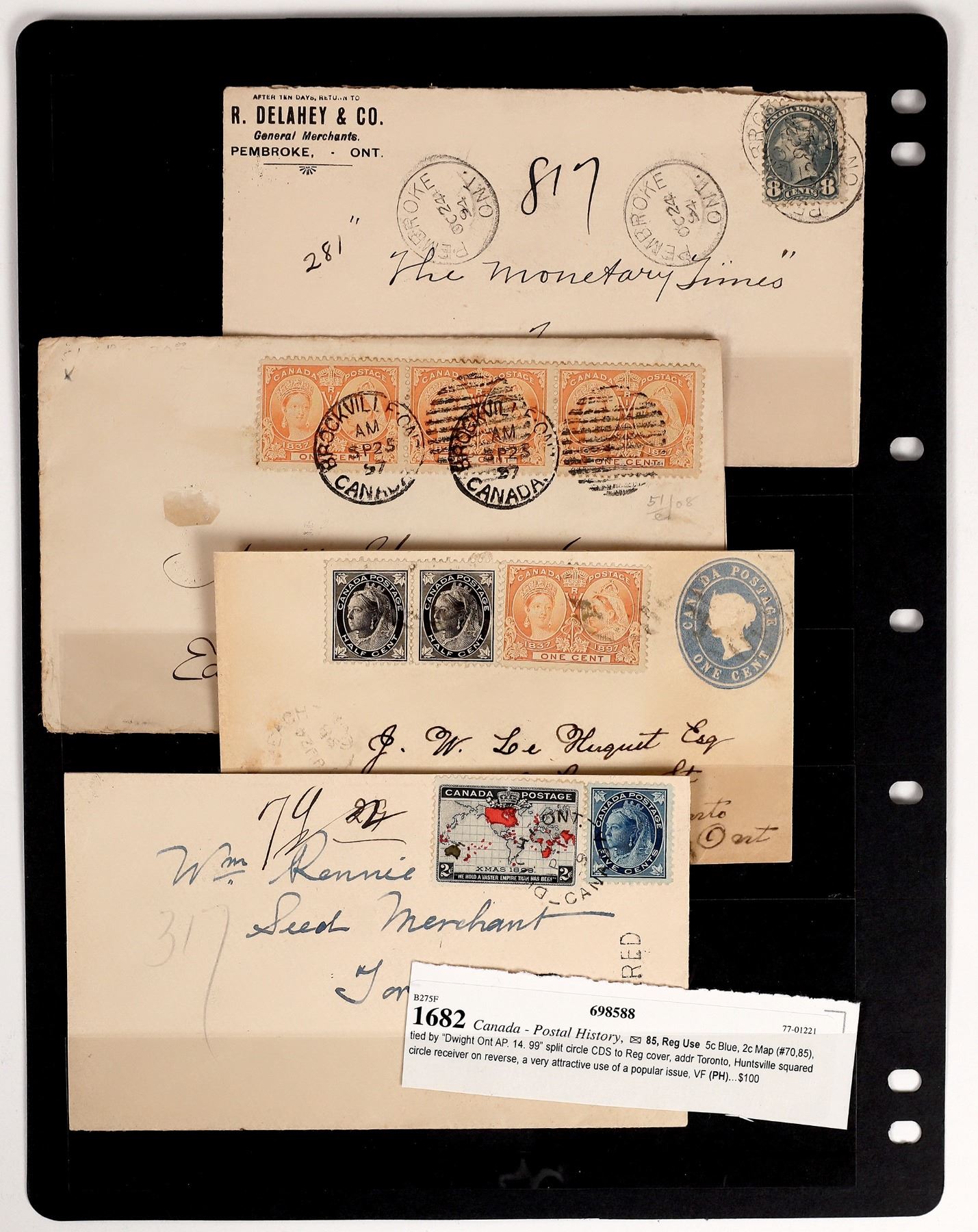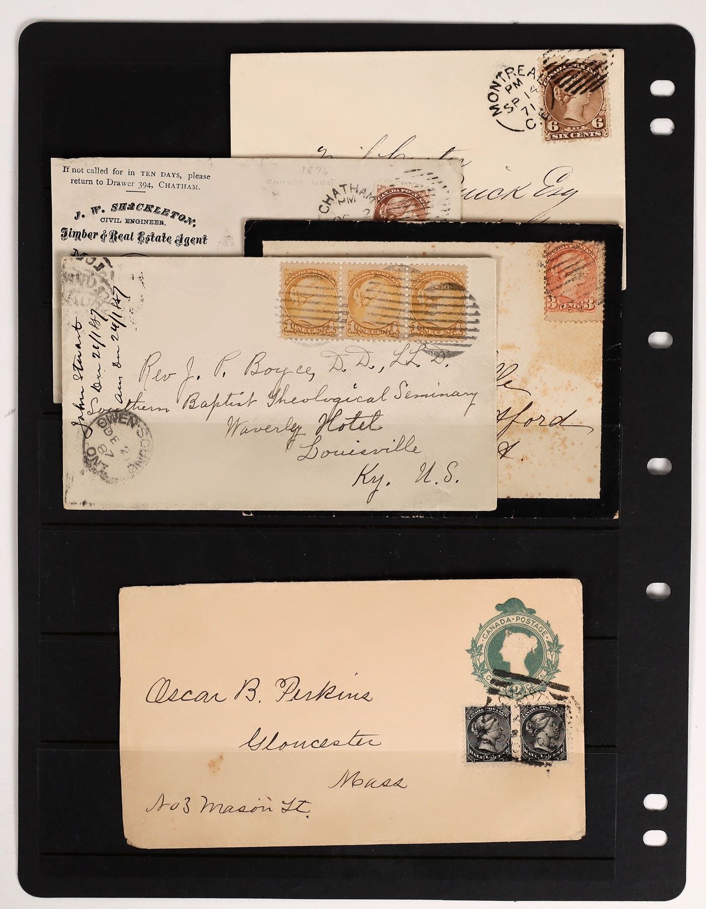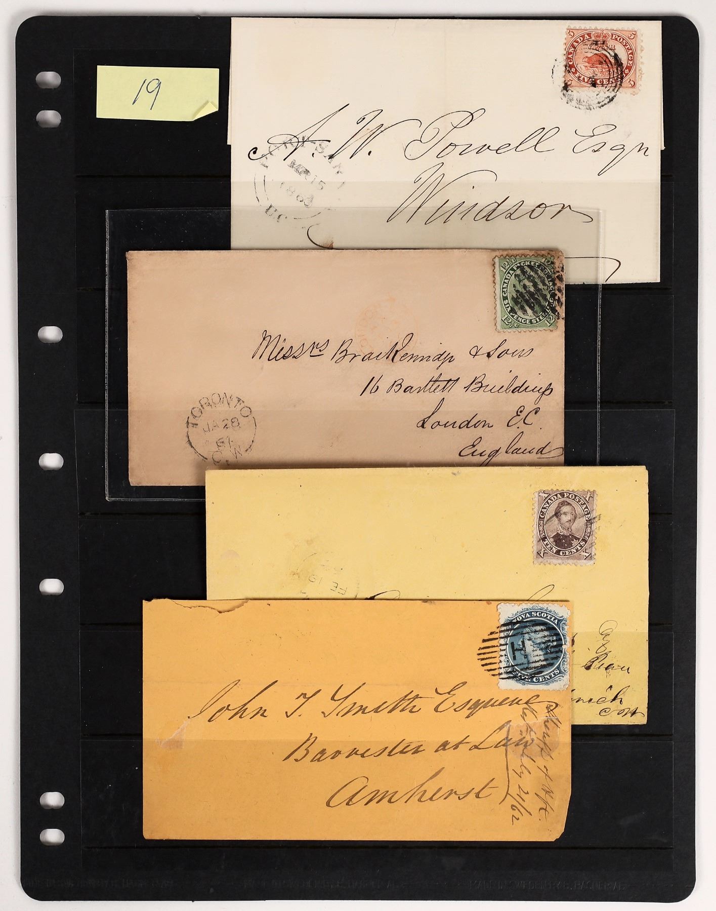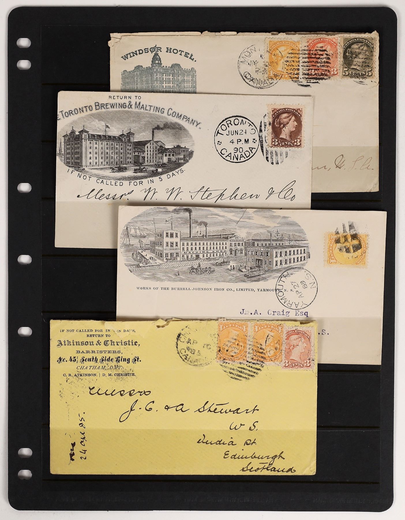 Canada. 1860-1911, varied group of 21 covers, incl.` 1860 lettersheet with 5c Beaver, one inner flap missing, 1861 to London with 12Ωc, 1863 with Nova Scotia 5c, 1864 with Albert 10c, nice group of Large and Small Queens (x10) incl. 1871 6c single franking, 1884 1/2c pair on 2c envelope to U.S., Windsor Hotel three-color franking to U.S., etc., 1899 regis. to U.S. with 1898 Xmas 2c, five with pictorial ads incl. 1890 Toronto Brewing & Malting, please see scans.