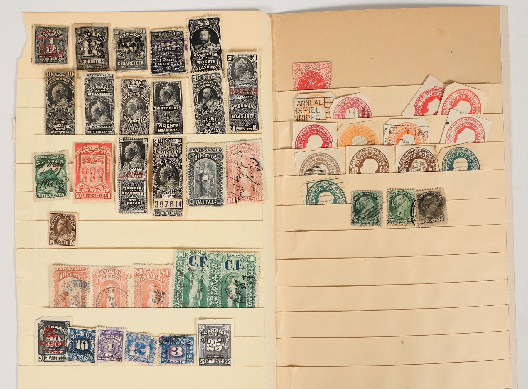 Canada revenue adhesive stamps & envelope stamps. About 30 intricately designed stamps, reasonably well centered. See photo.