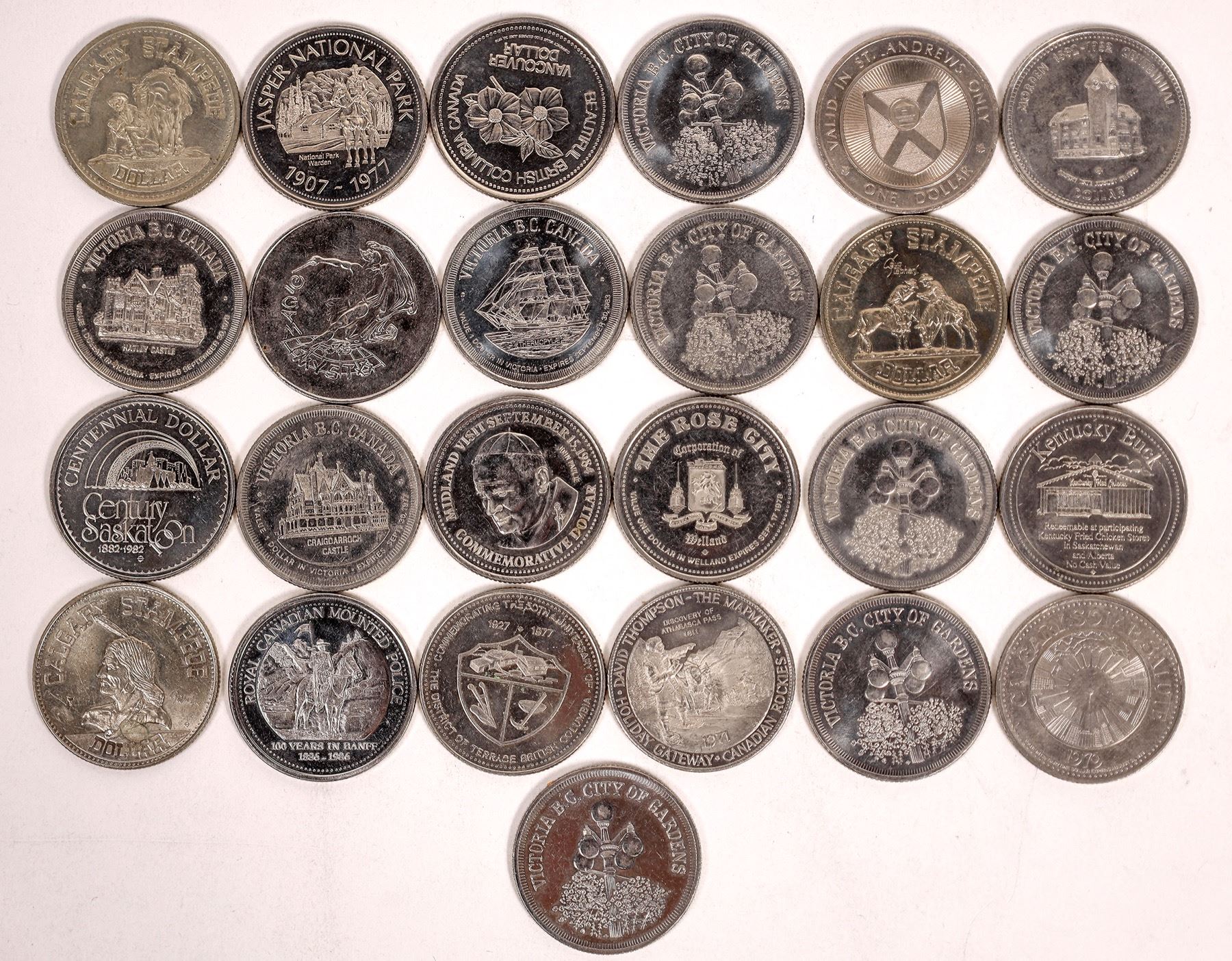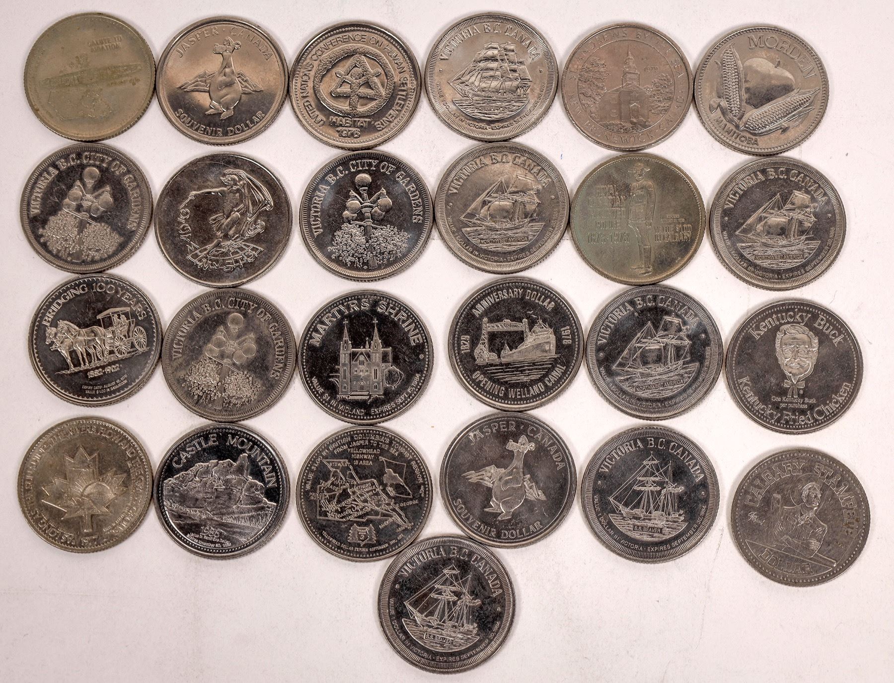 Lot of 25 souvenir dollars from various cities and provinces of Canada. Calgary Stampede; Victoria B.C.; Jasper; Saskatoon; Vancouver and others. City: State: Date: Salvatore Falcone Collection