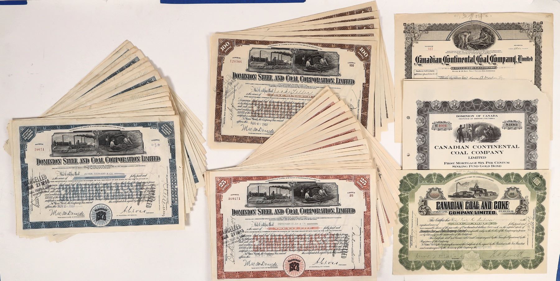 Lot of 50+. Includes: Canadian Continental Coal Co., Ltd. (1929 stock and $100 bond, 1914); Canadian Coal & Coke Company, Ltd. (1915 stock); and Dominion Steel & Coal Corporation, Limited (53 stocks, three types, 1930s-40s). Please inspect.